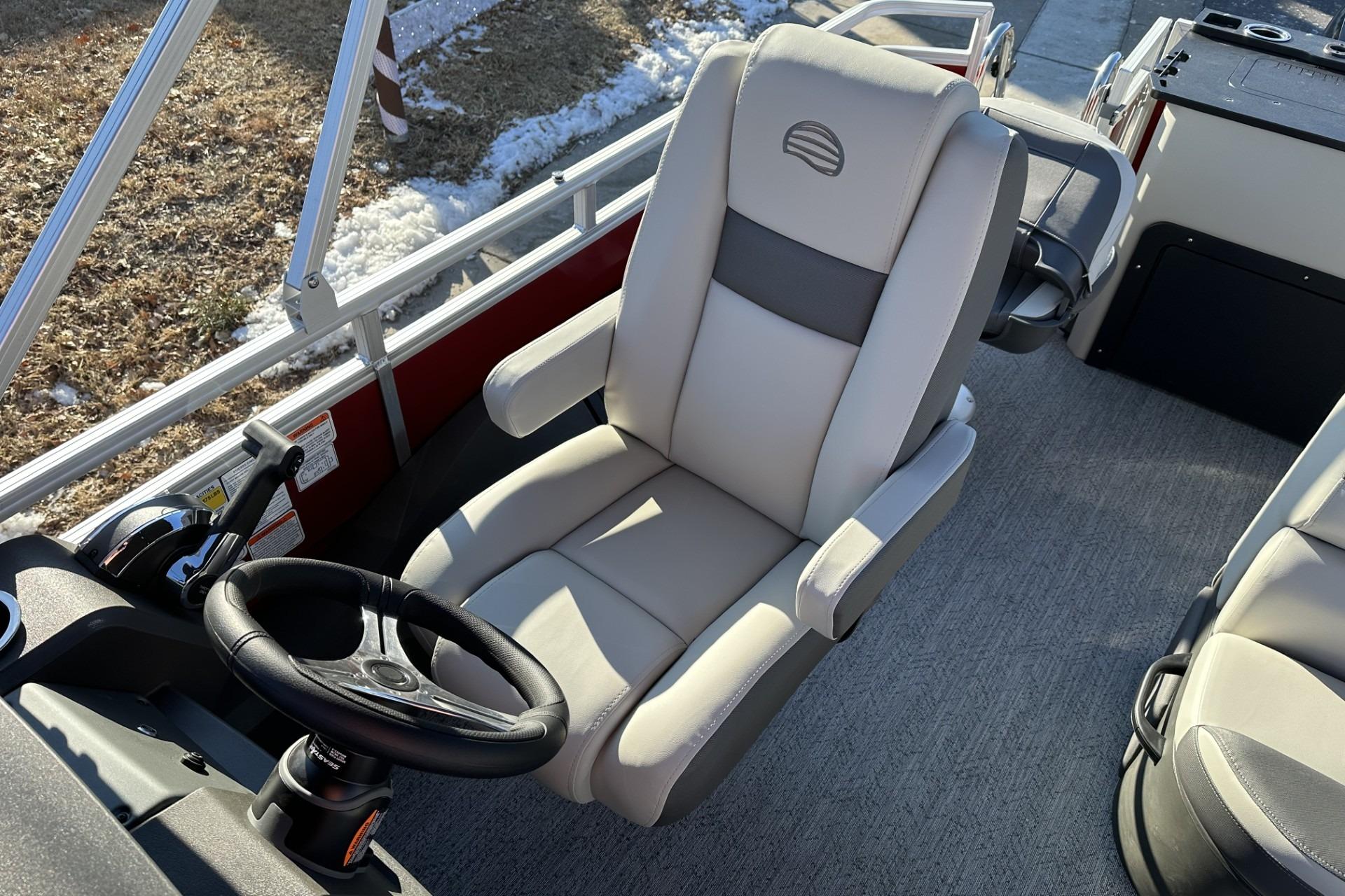 • Reclining, high-back swiveling helm bucket seat w/self-leveling armrests