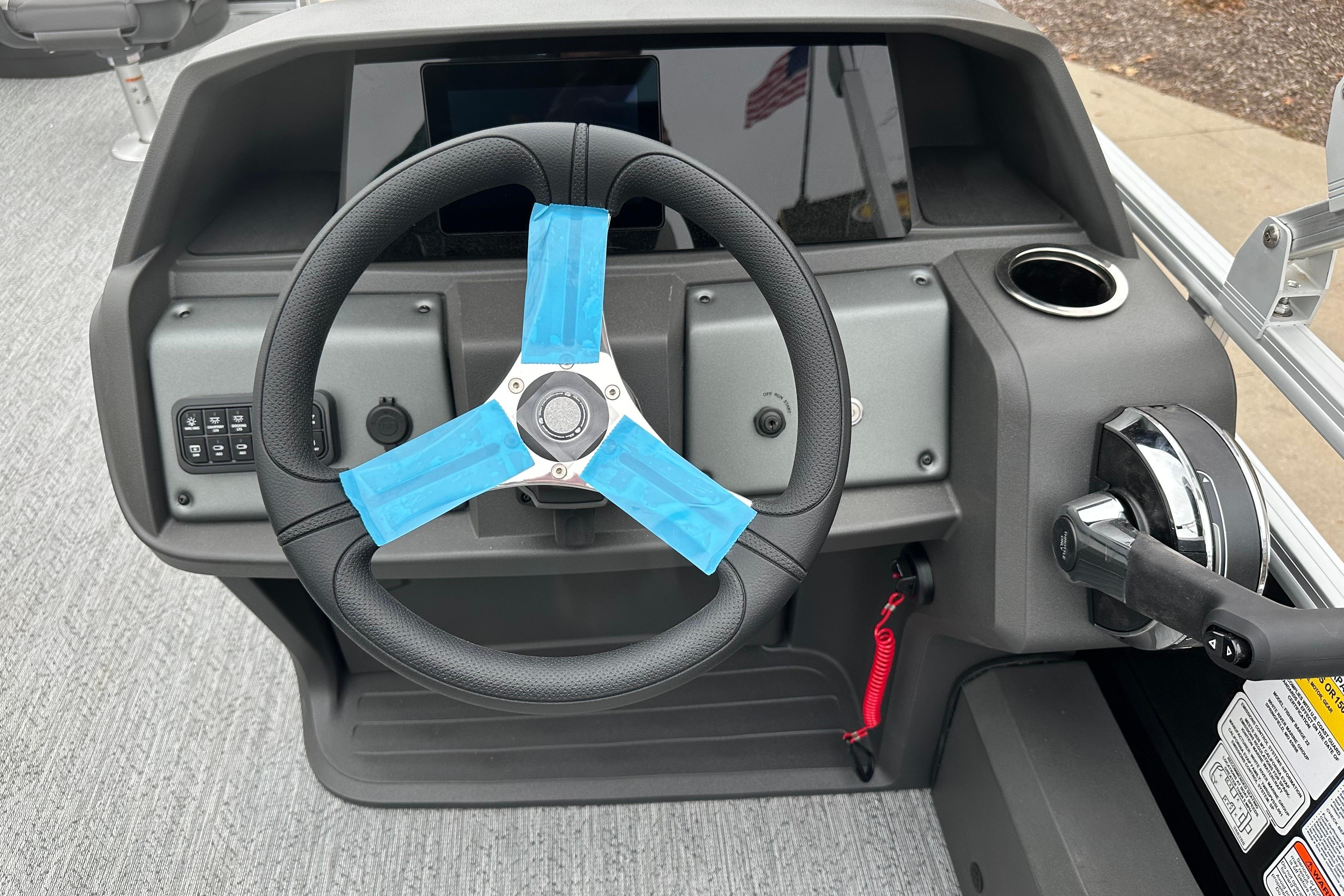 The 2026 SUN TRACKER® FISHIN’ BARGE® 22 XP3's third pontoon, lifting strakes, and hydraulic steering let it operate like a fiberglass boat with the stability only a pontoon can offer.
