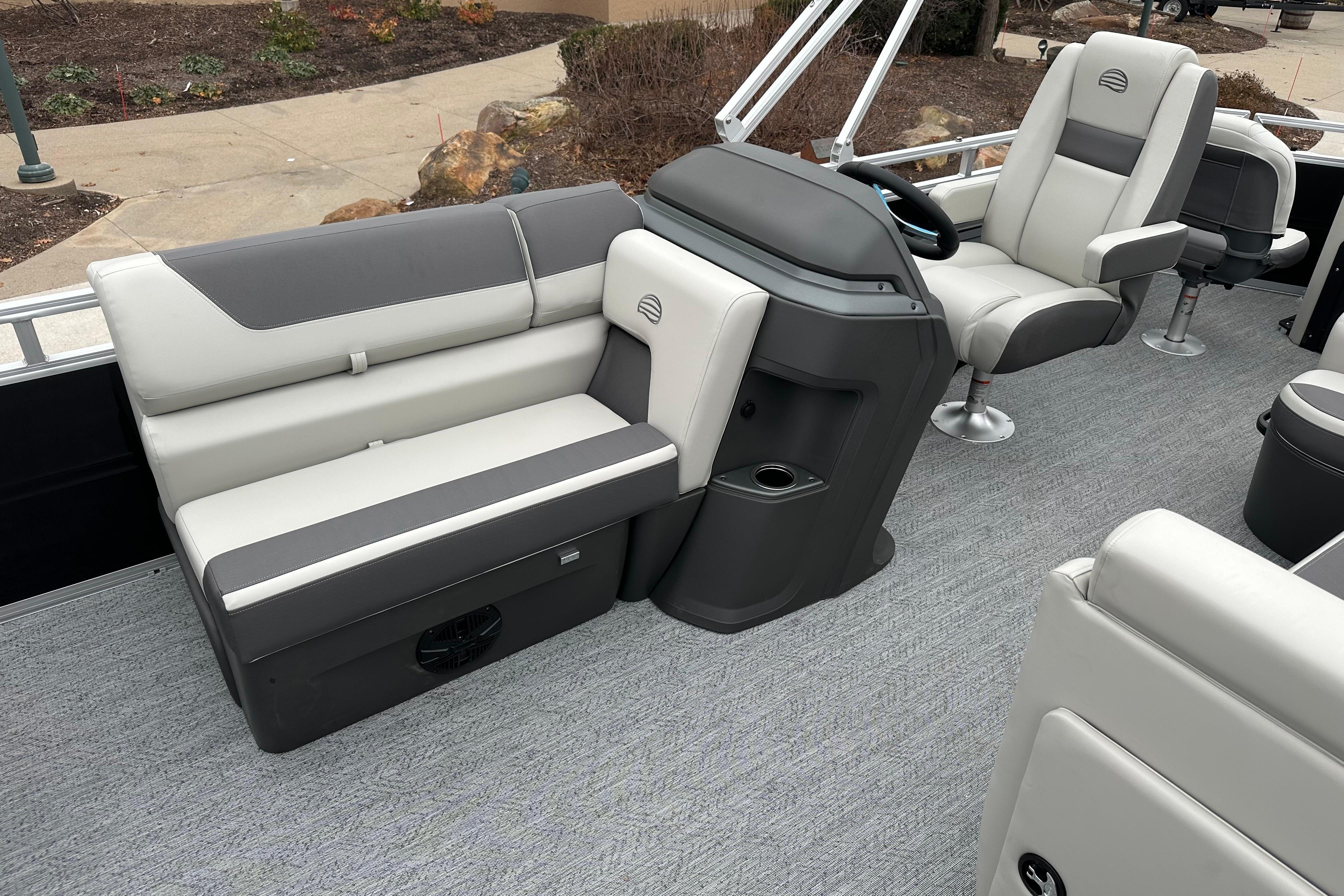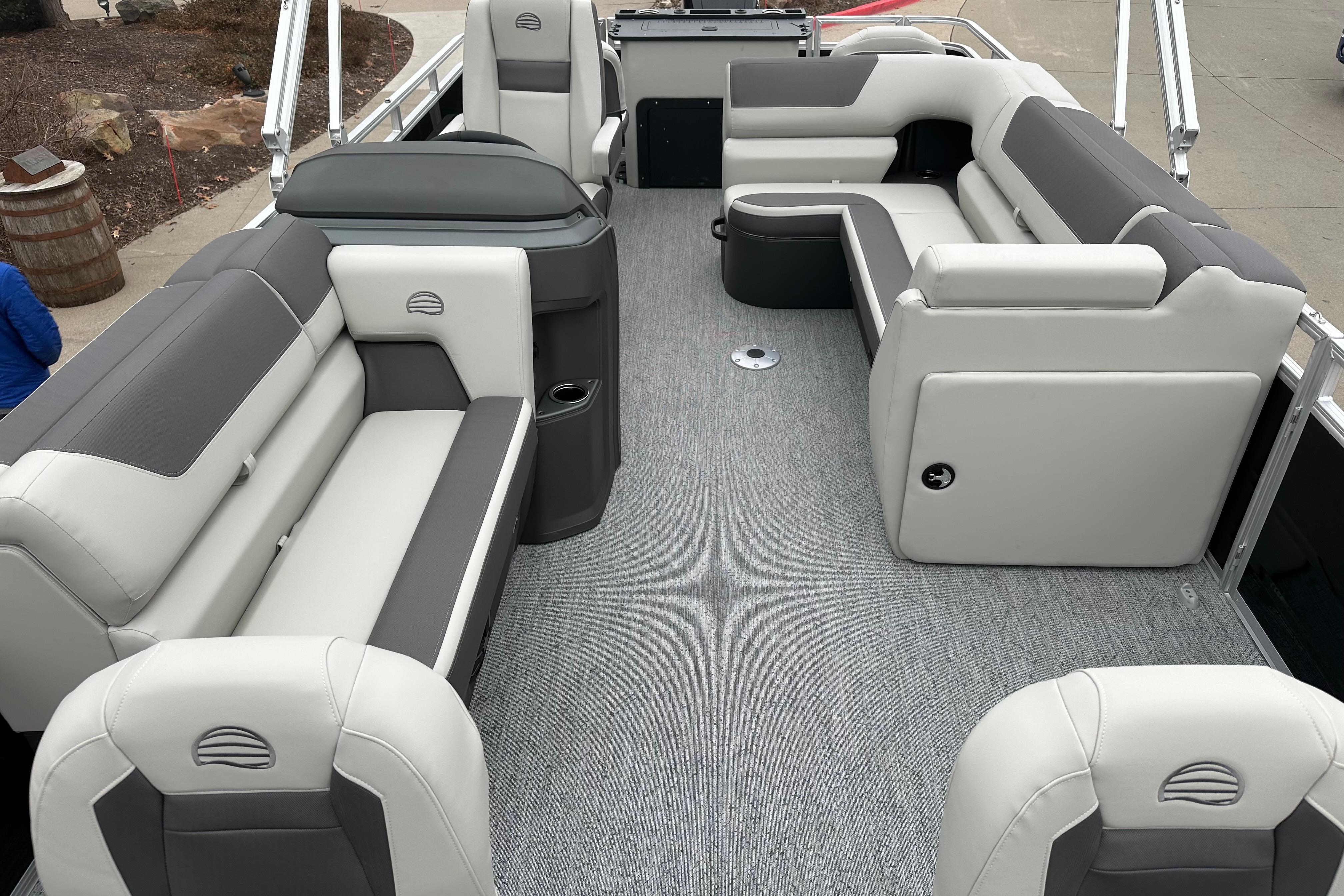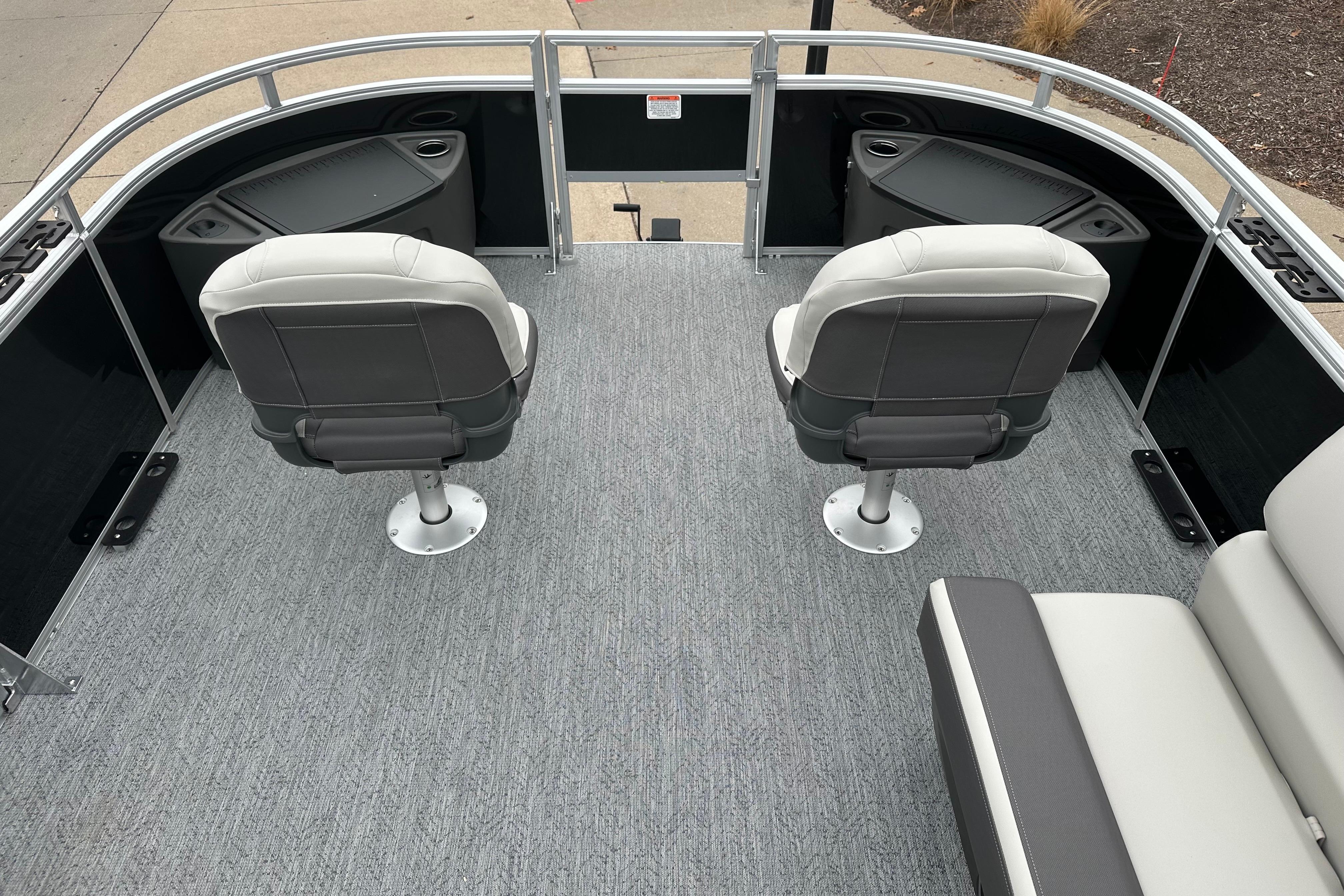 Captains can control it all with the SUN TRACKER FLARE™ touch-screen gauge display. Set up the 10' bimini top, grab your rod out of the lockable rod box, and post up in one of the two fishing decks—each of which sports a 16-gal. aerated livewell—and two swiveling fishing chairs next to rod and tool holders. The dual lounges or aft bench with hidden storage are ready for relaxation. The lounges’ all-new open section in the backrest increases accessible storage and even has extra cupholders. 2026 also brings a wider, ergonomic boarding ladder.