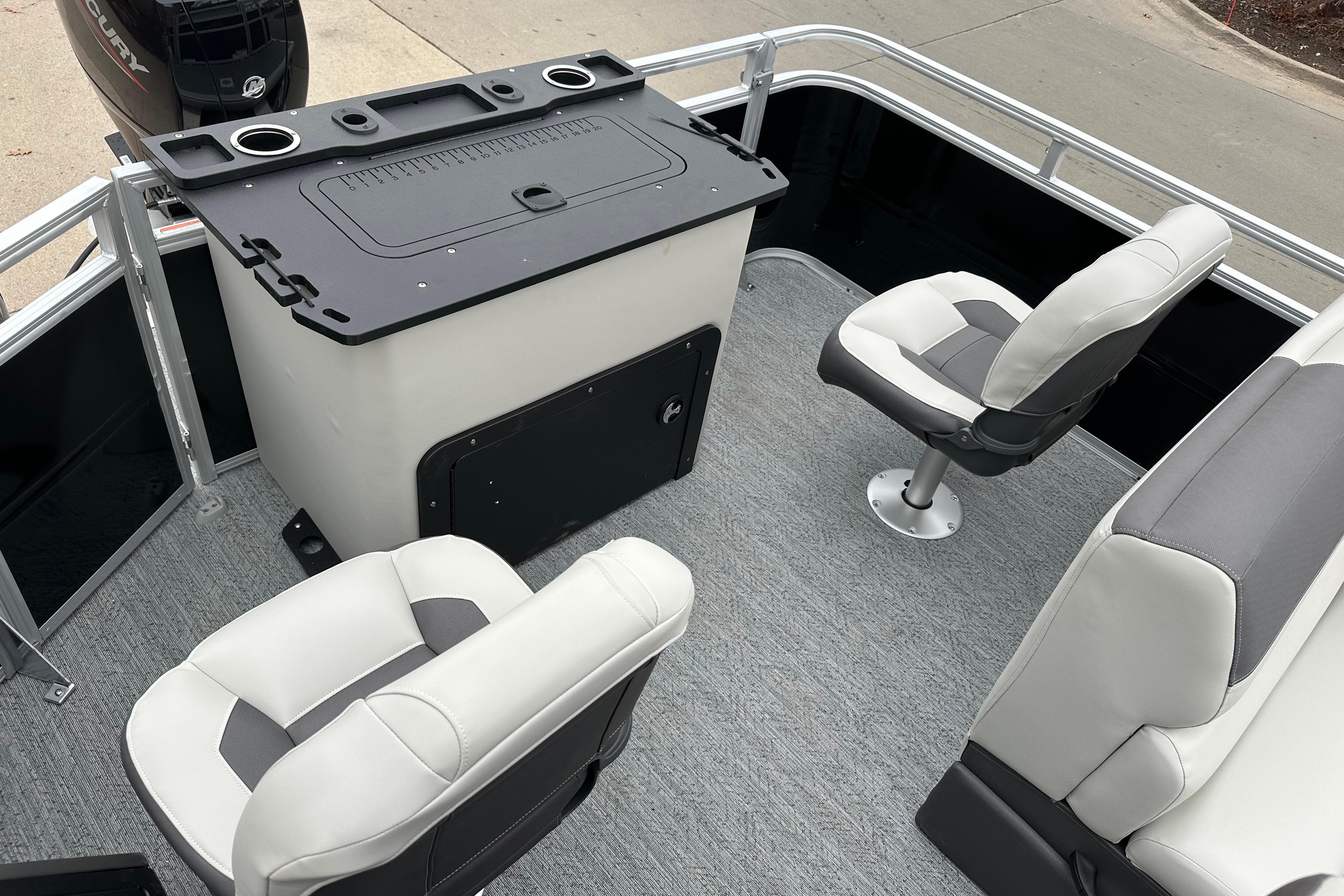 • Front fishing station w/2 pedestal seat base locations; rail-mounted rod & tool holders; & bow starboard storage compartment w/drink holder, rod holder & composite lid w/fish ruler