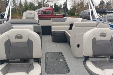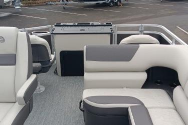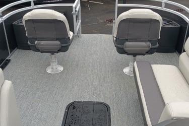 Captains can control it all with the SUN TRACKER FLARE™ touch-screen gauge display. Set up the 10' bimini top, grab your rod out of the lockable rod box, and post up in one of the two fishing decks—each of which sports a 16-gal. aerated livewell—and two swiveling fishing chairs next to rod and tool holders. The dual lounges or aft bench with hidden storage are ready for relaxation. The lounges’ all-new open section in the backrest increases accessible storage and even has extra cupholders. 2026 also brings a wider, ergonomic boarding ladder.