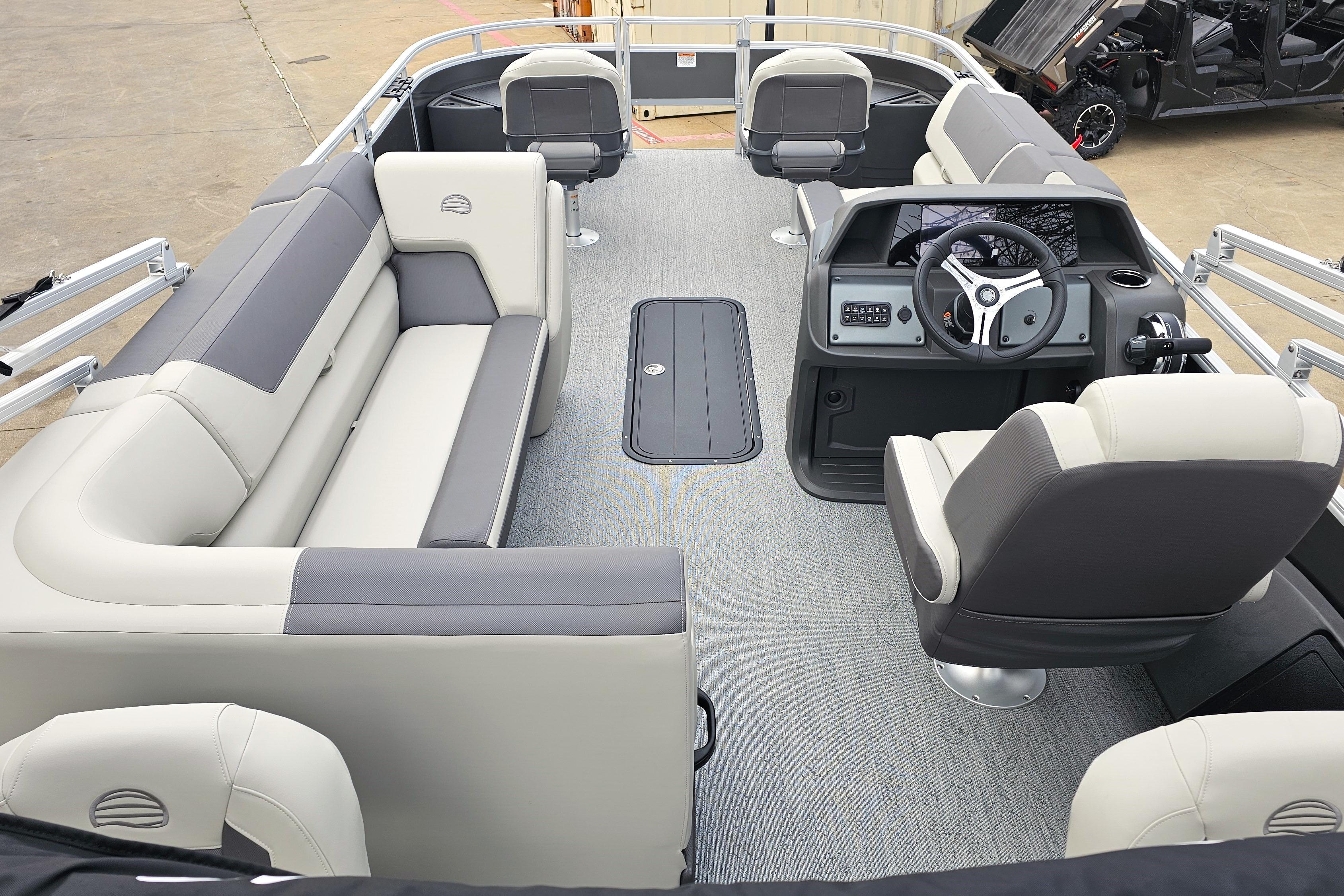 Captains can control it all with the SUN TRACKER FLARE™ touch-screen gauge display. Set up the 10' bimini top, grab your rod out of the lockable rod box, and post up in one of the two fishing decks—each of which sports a 16-gal. aerated livewell—and two swiveling fishing chairs next to rod and tool holders. The dual lounges or aft bench with hidden storage are ready for relaxation. The lounges’ all-new open section in the backrest increases accessible storage and even has extra cupholders. 2026 also brings a wider, ergonomic boarding ladder.