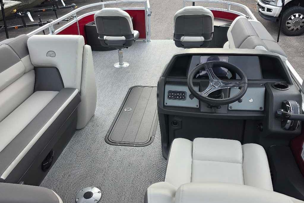 Captains can control it all with the SUN TRACKER FLARE™ touch-screen gauge display. Set up the 10' bimini top, grab your rod out of the lockable rod box, and post up in one of the two fishing decks—each of which sports a 16-gal. aerated livewell—and two swiveling fishing chairs next to rod and tool holders. The dual lounges or aft bench with hidden storage are ready for relaxation. The lounges’ all-new open section in the backrest increases accessible storage and even has extra cupholders. 2026 also brings a wider, ergonomic boarding ladder.