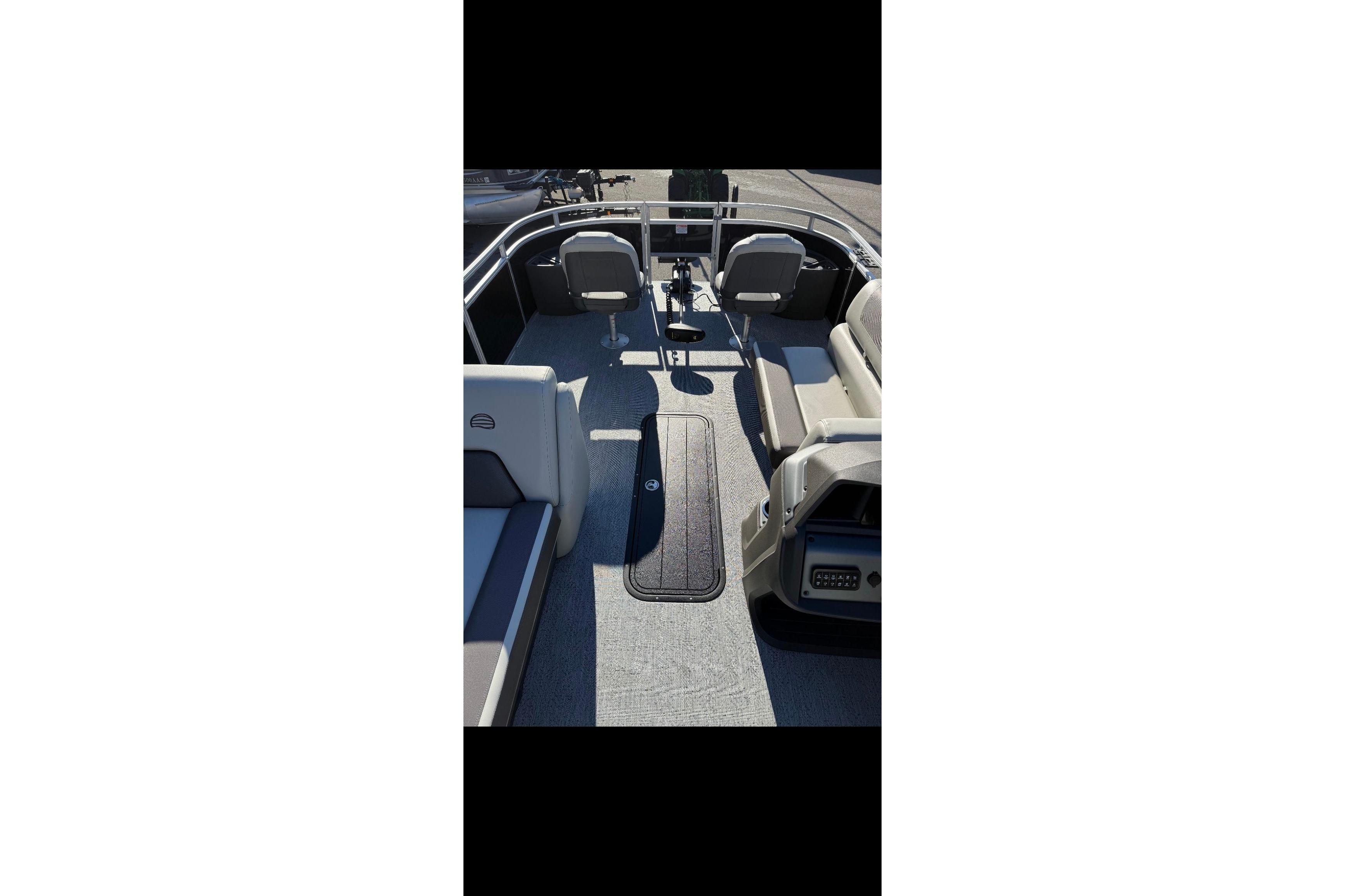 • Front fishing station w/2 pedestal seat base locations; rail-mounted rod & tool holders; & bow starboard storage compartment w/drink holder, rod holder & composite lid w/fish ruler