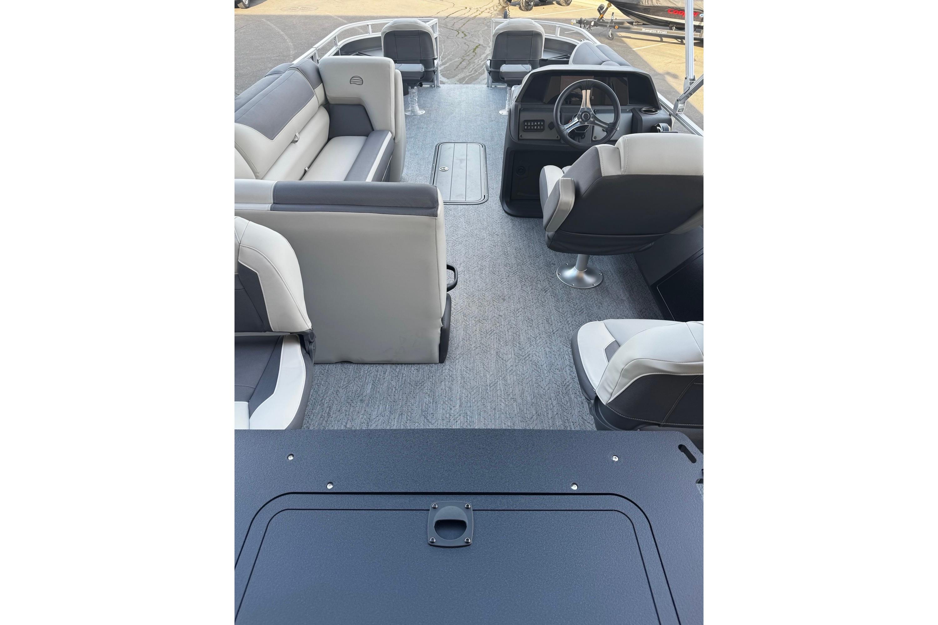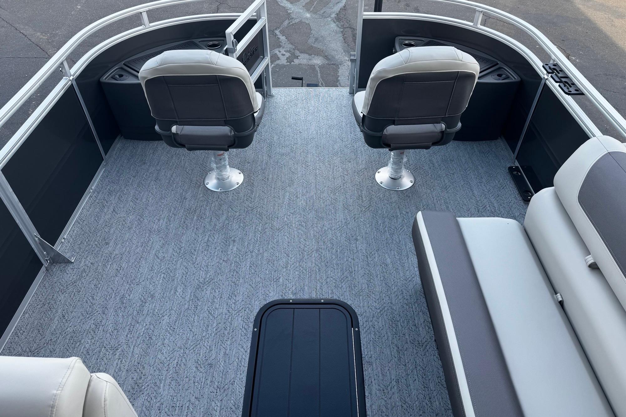 Captains can control it all with the SUN TRACKER FLARE™ touch-screen gauge display. Set up the 10' bimini top, grab your rod out of the lockable rod box, and post up in one of the two fishing decks—each of which sports a 16-gal. aerated livewell—and two swiveling fishing chairs next to rod and tool holders. The dual lounges or aft bench with hidden storage are ready for relaxation. The lounges’ all-new open section in the backrest increases accessible storage and even has extra cupholders. 2026 also brings a wider, ergonomic boarding ladder.