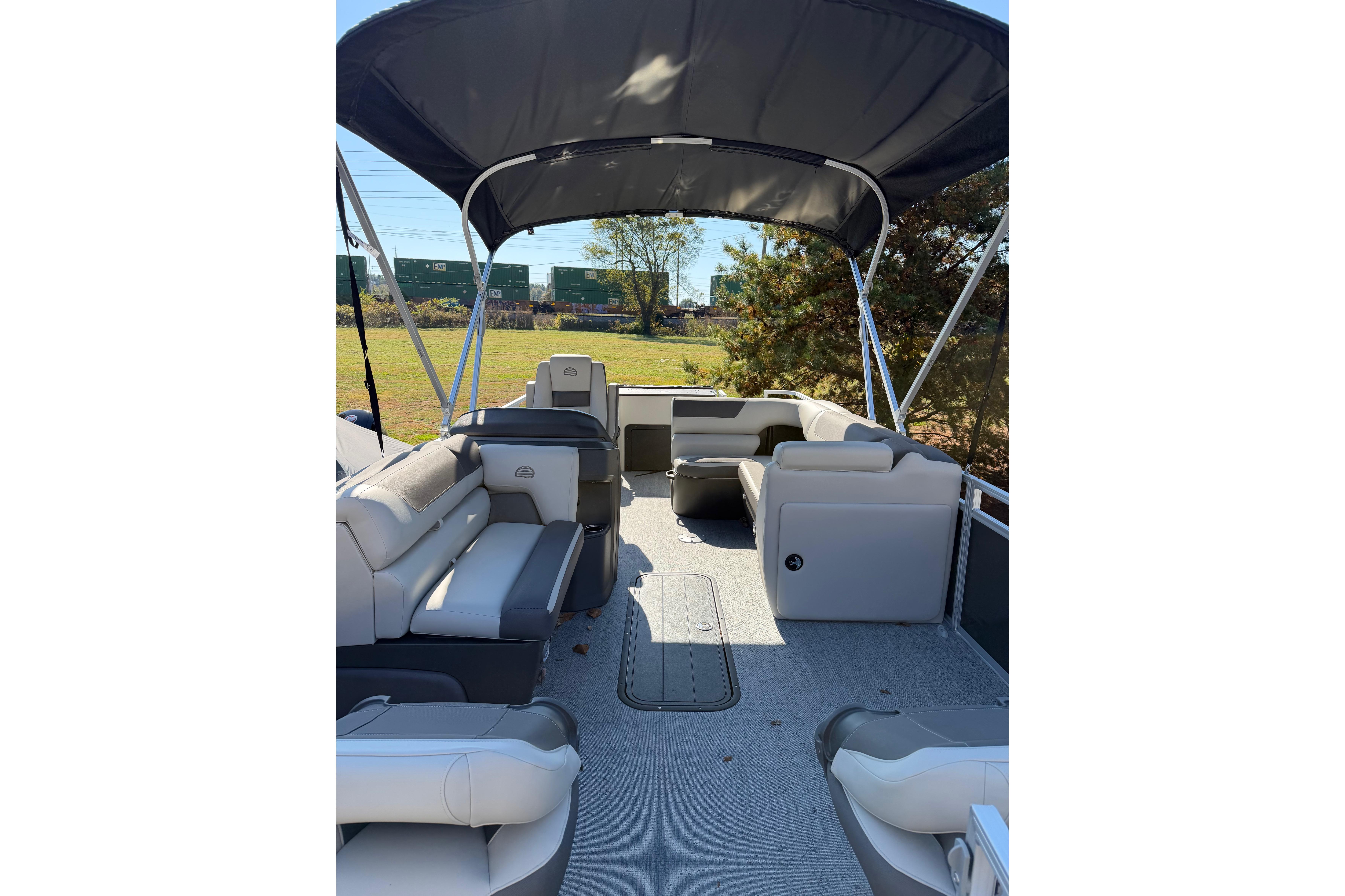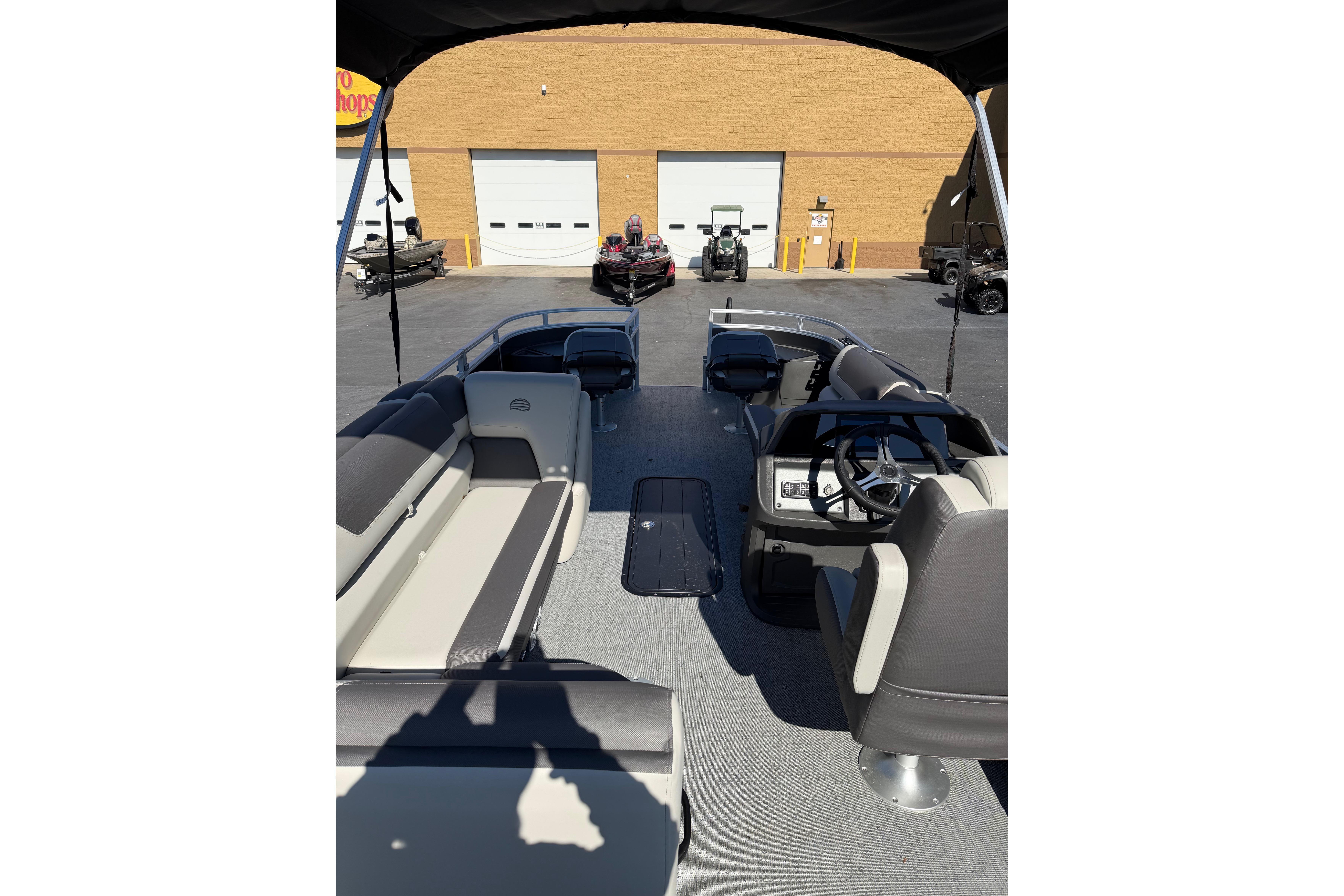Captains can control it all with the SUN TRACKER FLARE™ touch-screen gauge display. Set up the 10' bimini top, grab your rod out of the lockable rod box, and post up in one of the two fishing decks—each of which sports a 16-gal. aerated livewell—and two swiveling fishing chairs next to rod and tool holders. The dual lounges or aft bench with hidden storage are ready for relaxation. The lounges’ all-new open section in the backrest increases accessible storage and even has extra cupholders. 2026 also brings a wider, ergonomic boarding ladder.