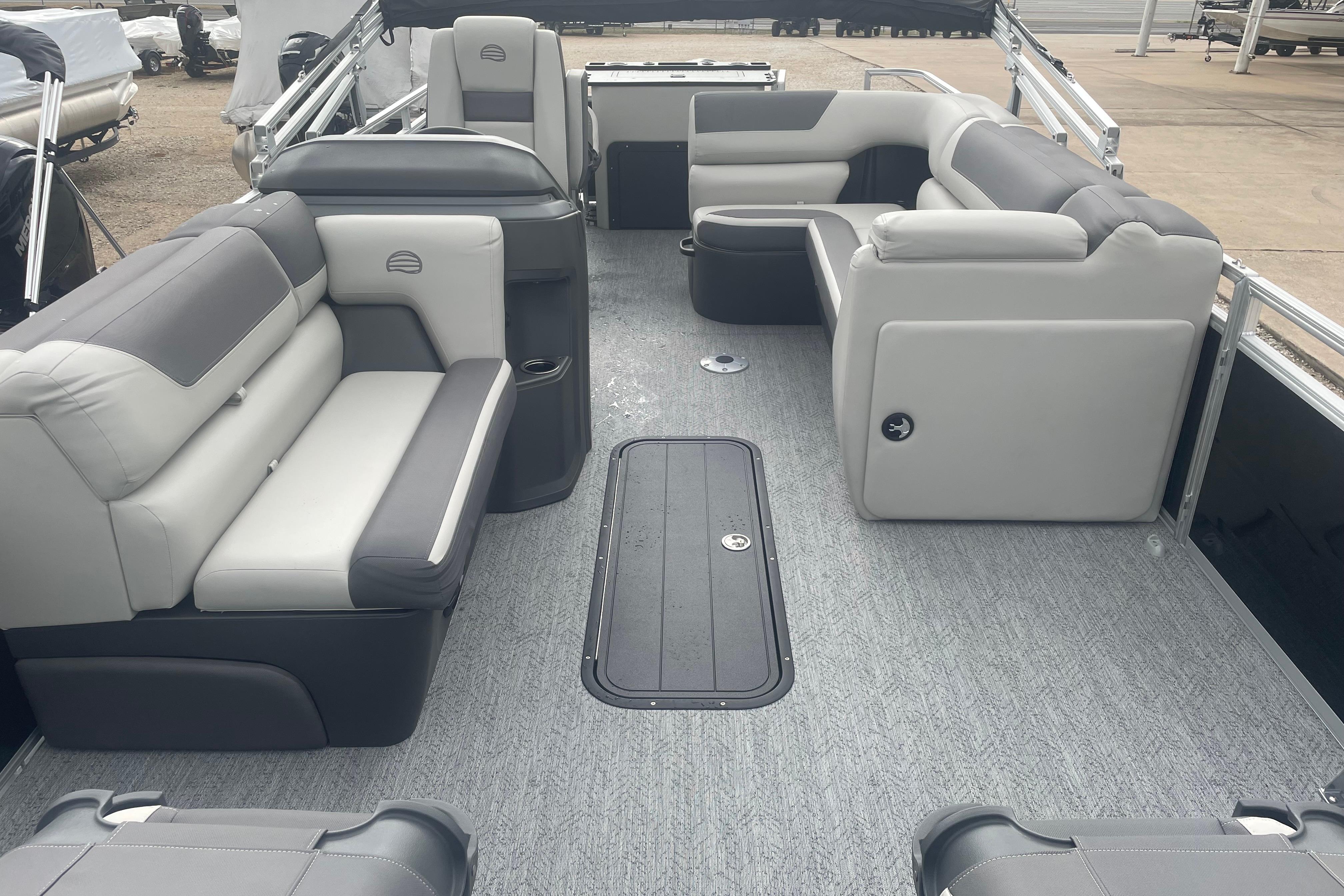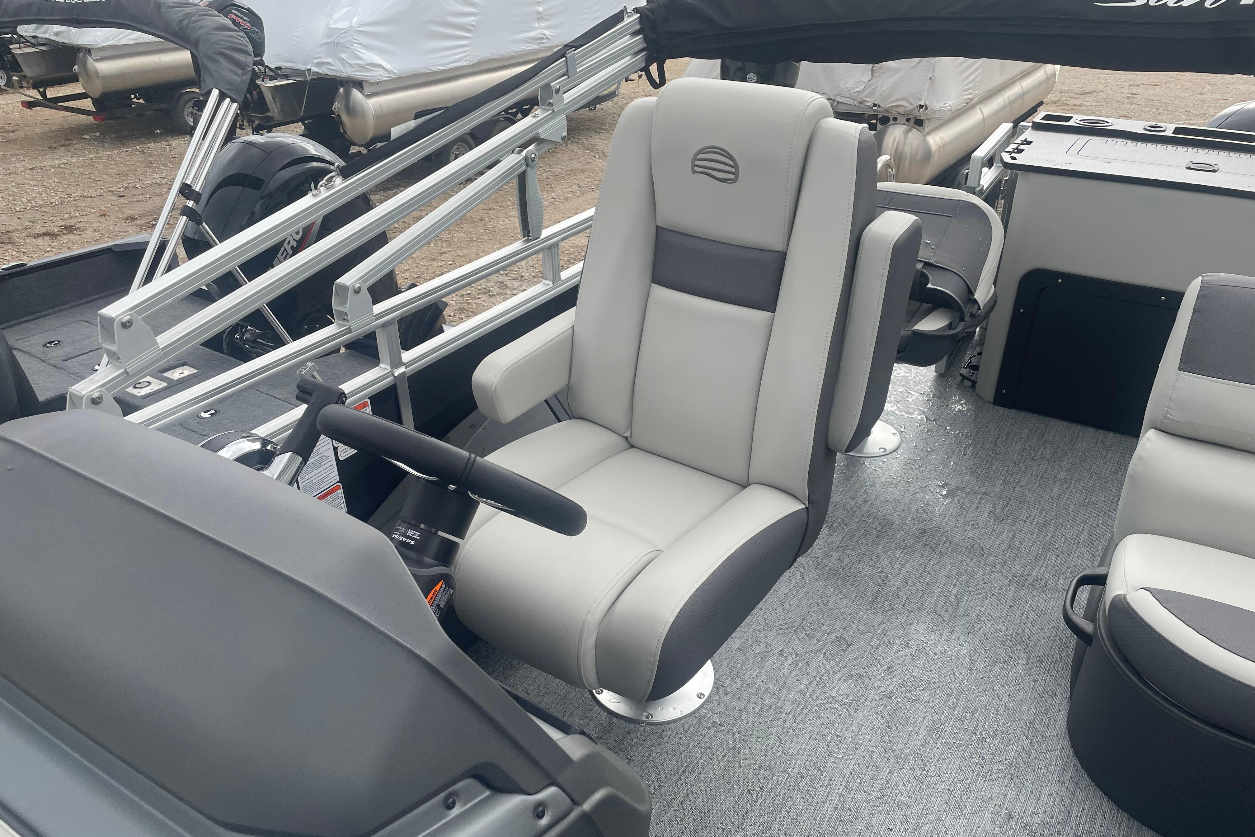 Captains can control it all with the SUN TRACKER FLARE™ touch-screen gauge display. Set up the 10' bimini top, grab your rod out of the lockable rod box, and post up in one of the two fishing decks—each of which sports a 16-gal. aerated livewell—and two swiveling fishing chairs next to rod and tool holders. The dual lounges or aft bench with hidden storage are ready for relaxation. The lounges’ all-new open section in the backrest increases accessible storage and even has extra cupholders. 2026 also brings a wider, ergonomic boarding ladder.