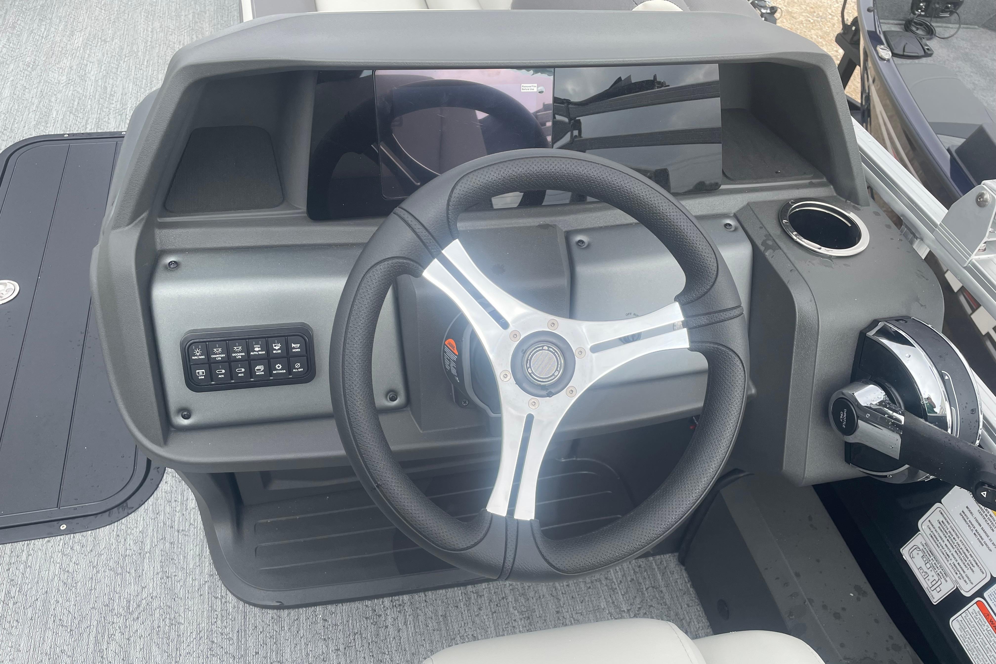 The 2026 SUN TRACKER® FISHIN’ BARGE® 22 XP3's third pontoon, lifting strakes, and hydraulic steering let it operate like a fiberglass boat with the stability only a pontoon can offer.