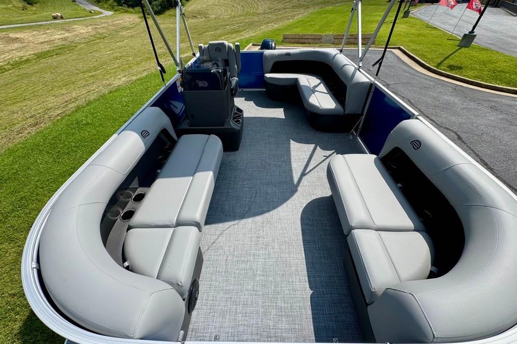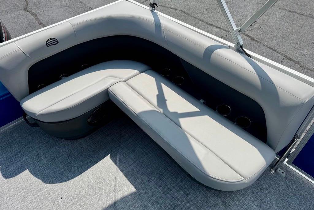This year's PARTY BARGE gets some slick upgrades. Extra cupholders and storage built into the lounge backrests and improved handles make keeping your supplies at hand easier than ever. A new driver console design creates extra style. The boarding ladder has wider, more ergonomic steps. Crank up the soundtrack of the summer with the standard Bluetooth®-capable Wet Sounds™ stereo and pull up the 7' bimini top to party in the shade when the sun is high. Find your corner of the lake and relax in one of the three corner lounges.