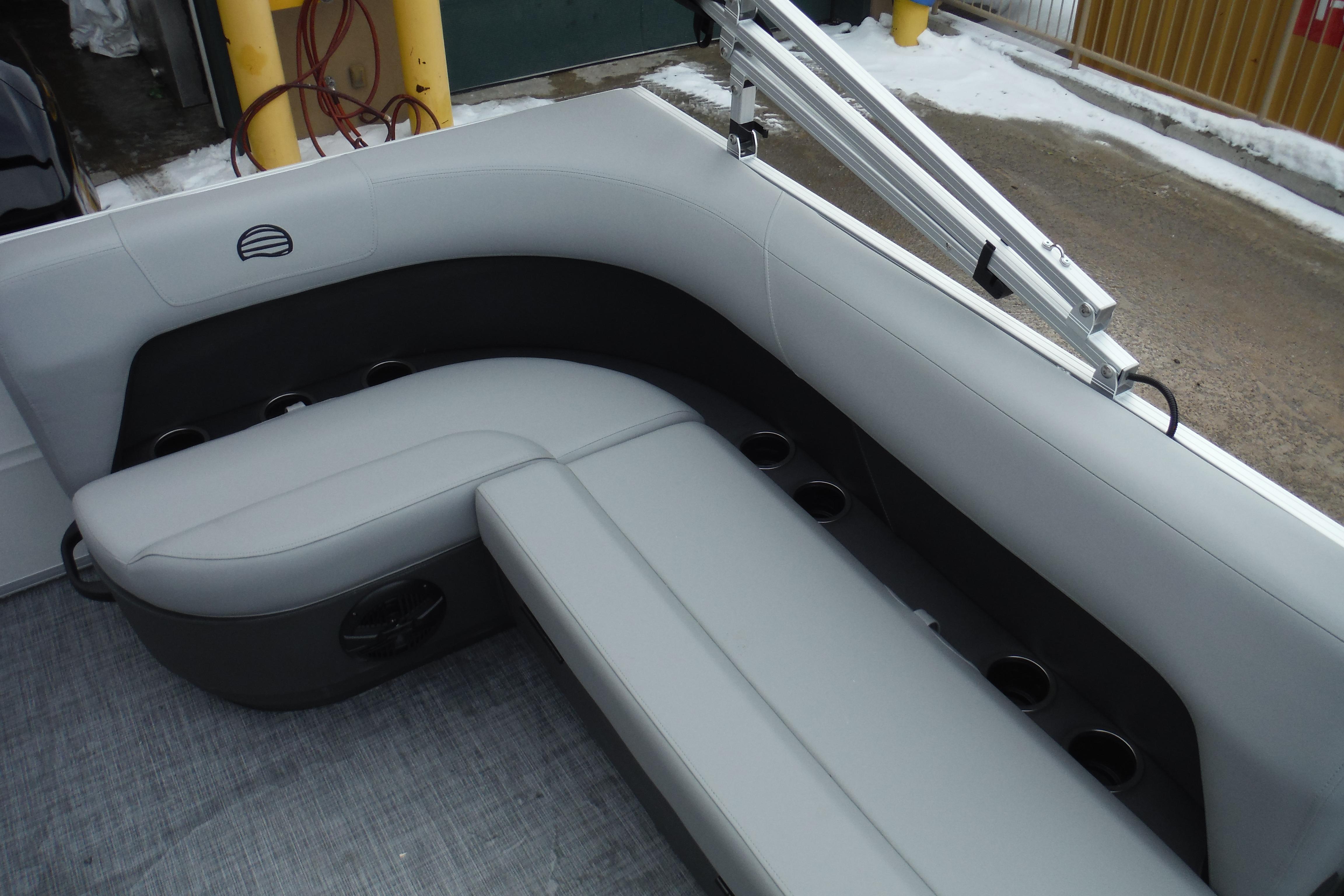 This year's PARTY BARGE gets some slick upgrades. Extra cupholders and storage built into the lounge backrests and improved handles make keeping your supplies at hand easier than ever. A new driver console design creates extra style. The boarding ladder has wider, more ergonomic steps. Crank up the soundtrack of the summer with the standard Bluetooth®-capable Wet Sounds™ stereo and pull up the 7' bimini top to party in the shade when the sun is high. Find your corner of the lake and relax in one of the three corner lounges.