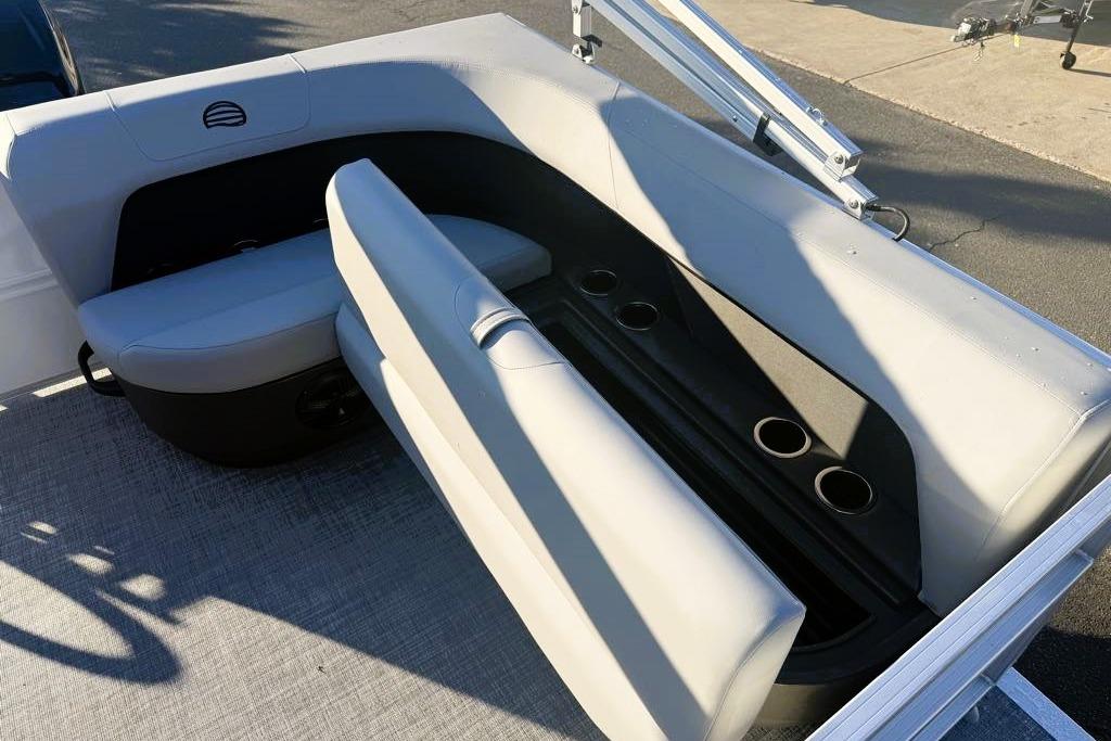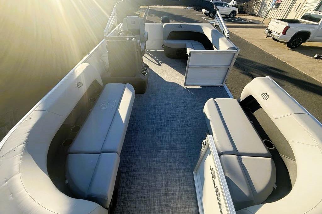 This year's PARTY BARGE gets some slick upgrades. Extra cupholders and storage built into the lounge backrests and improved handles make keeping your supplies at hand easier than ever. A new driver console design creates extra style. The boarding ladder has wider, more ergonomic steps. Crank up the soundtrack of the summer with the standard Bluetooth®-capable Wet Sounds™ stereo and pull up the 7' bimini top to party in the shade when the sun is high. Find your corner of the lake and relax in one of the three corner lounges.