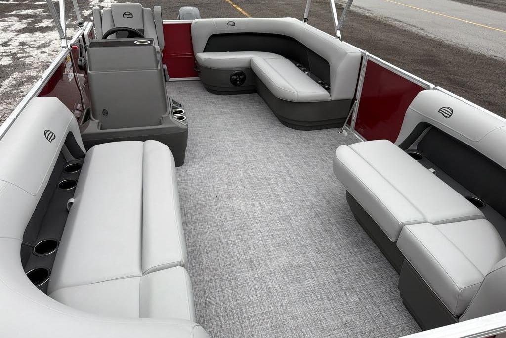 This year's PARTY BARGE gets some slick upgrades. Extra cupholders and storage built into the lounge backrests and improved handles make keeping your supplies at hand easier than ever. A new driver console design creates extra style. The boarding ladder has wider, more ergonomic steps. Crank up the soundtrack of the summer with the standard Bluetooth®-capable Wet Sounds™ stereo and pull up the 7' bimini top to party in the shade when the sun is high. Find your corner of the lake and relax in one of the three corner lounges.