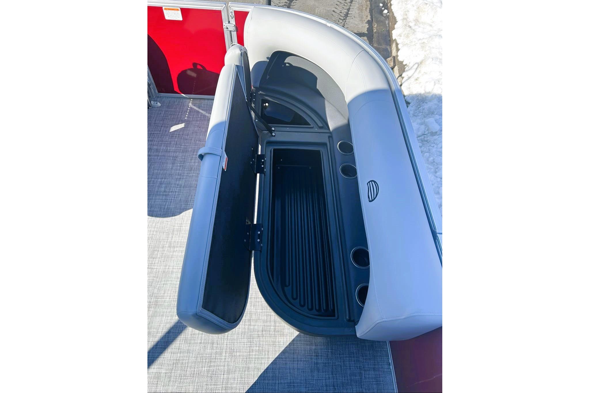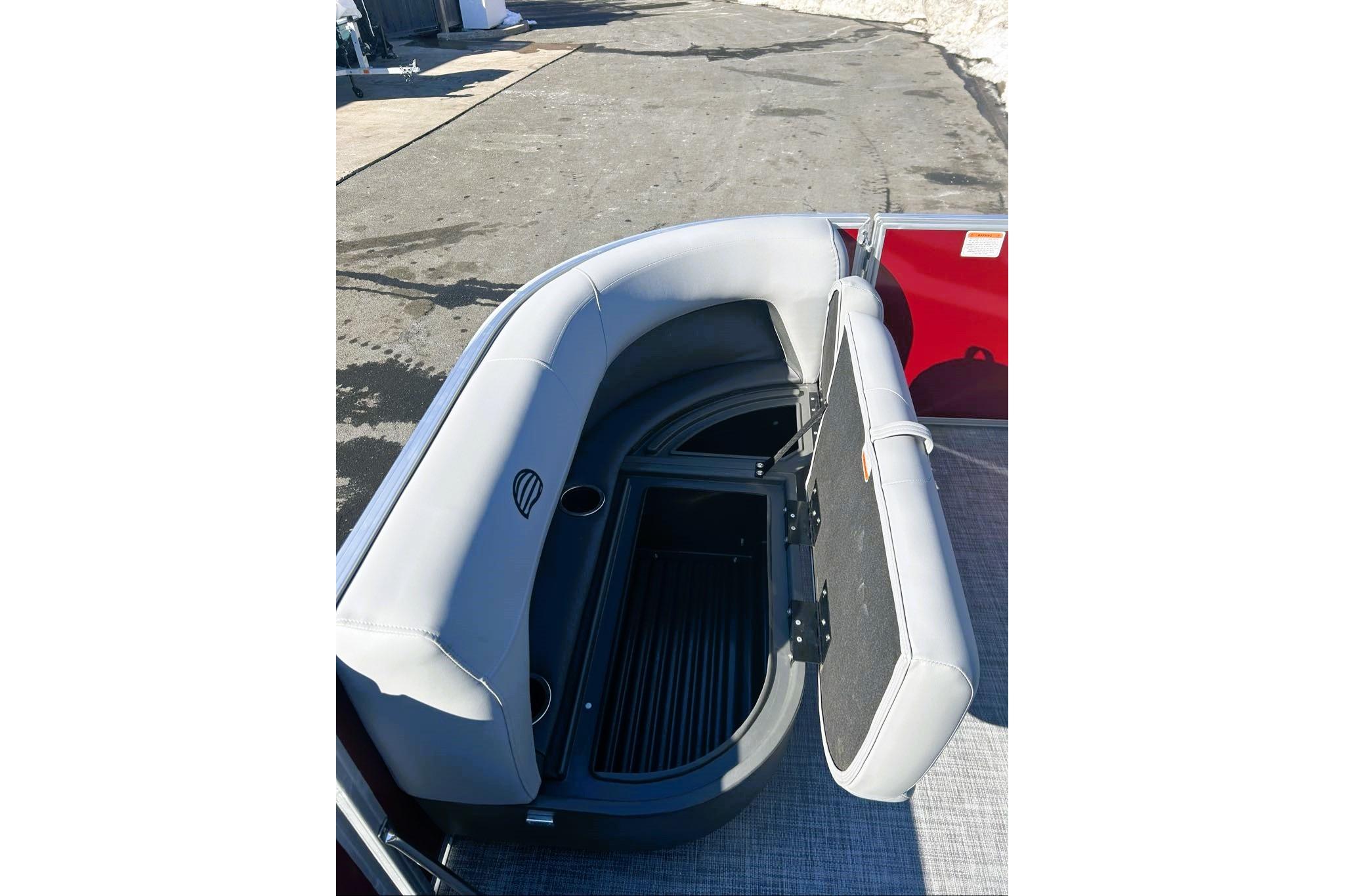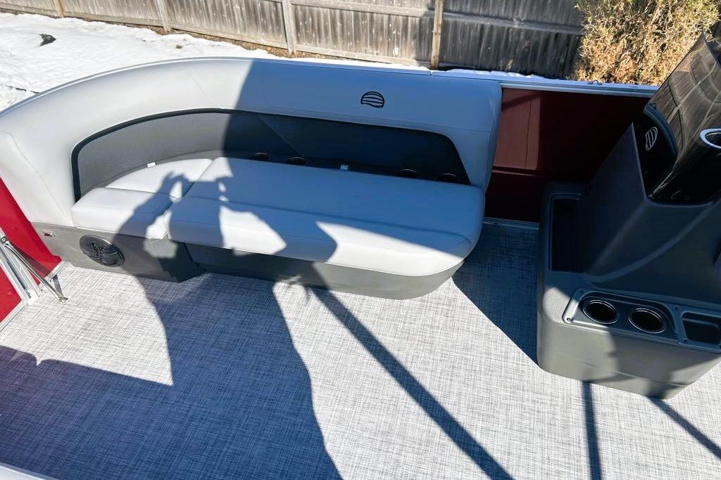 This year's PARTY BARGE gets some slick upgrades. Extra cupholders and storage built into the lounge backrests and improved handles make keeping your supplies at hand easier than ever. A new driver console design creates extra style. The boarding ladder has wider, more ergonomic steps. Crank up the soundtrack of the summer with the standard Bluetooth®-capable Wet Sounds™ stereo and pull up the 7' bimini top to party in the shade when the sun is high. Find your corner of the lake and relax in one of the three corner lounges.