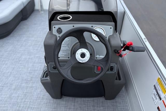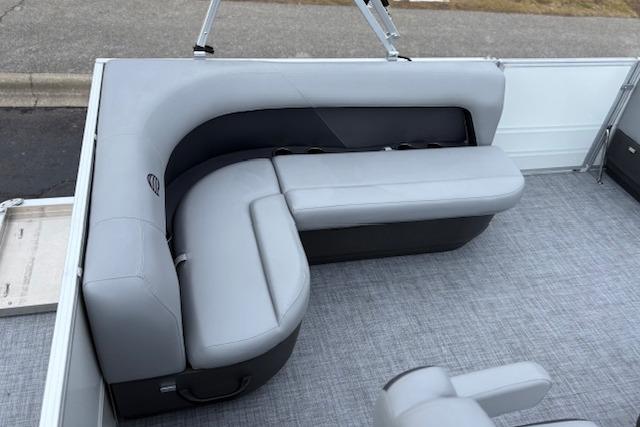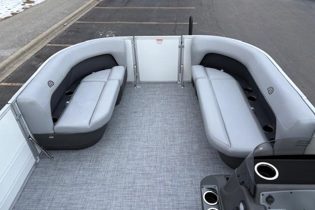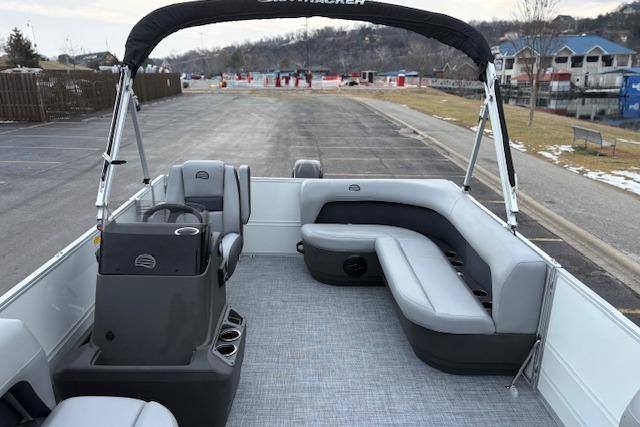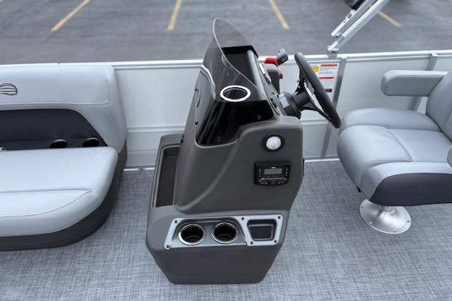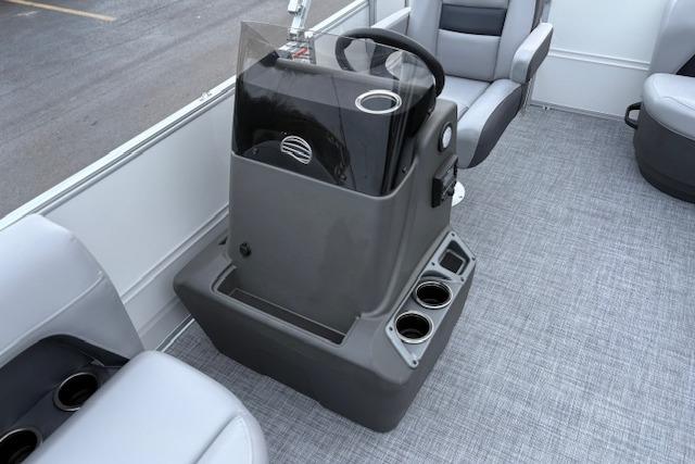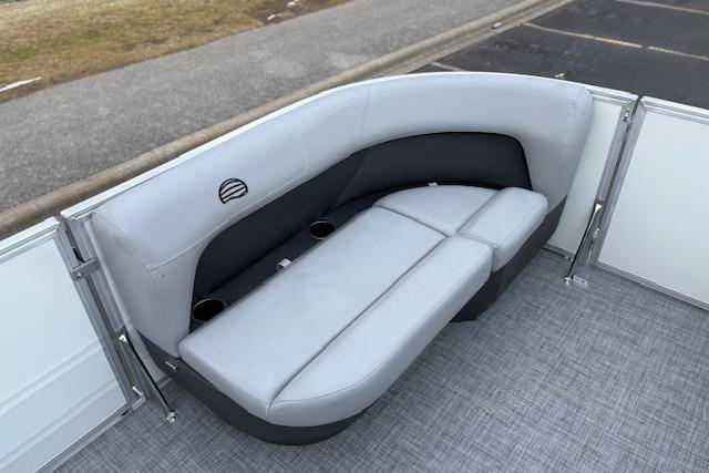 This year's PARTY BARGE gets some slick upgrades. Extra cupholders and storage built into the lounge backrests and improved handles make keeping your supplies at hand easier than ever. A new driver console design creates extra style. The boarding ladder has wider, more ergonomic steps. Crank up the soundtrack of the summer with the standard Bluetooth®-capable Wet Sounds™ stereo and pull up the 7' bimini top to party in the shade when the sun is high. Find your corner of the lake and relax in one of the three corner lounges.