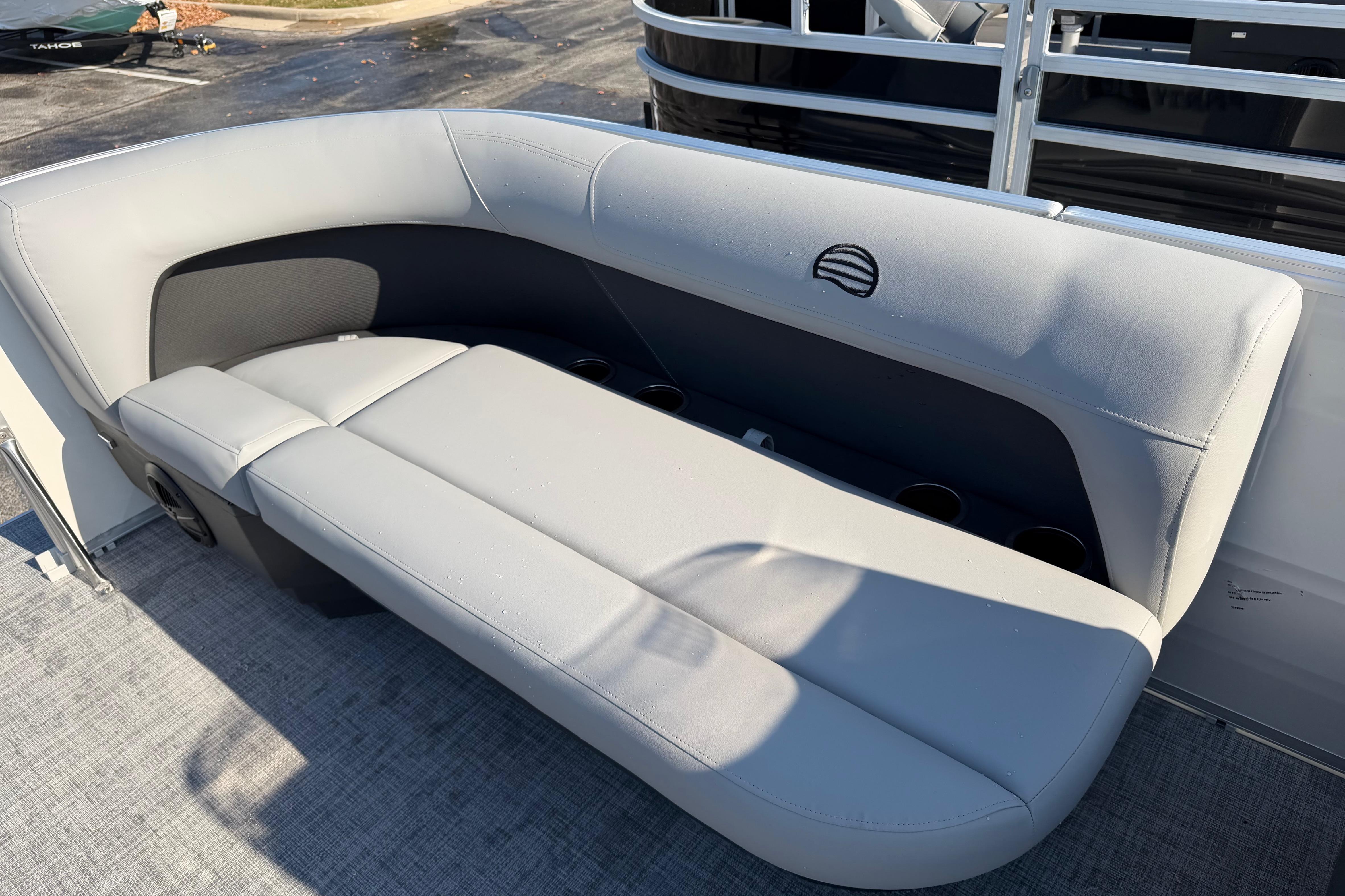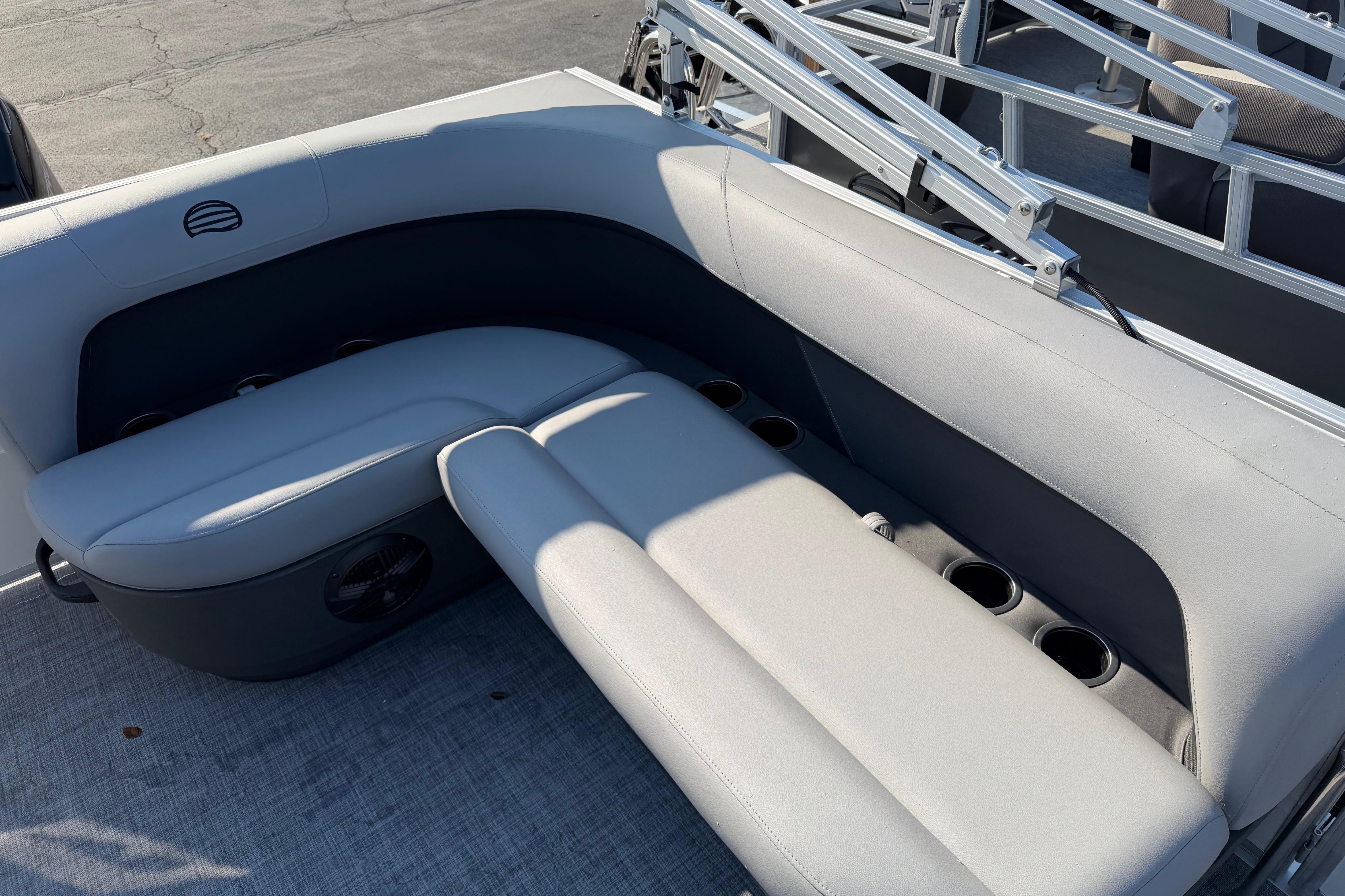 This year's PARTY BARGE gets some slick upgrades. Extra cupholders and storage built into the lounge backrests and improved handles make keeping your supplies at hand easier than ever. A new driver console design creates extra style. The boarding ladder has wider, more ergonomic steps. Crank up the soundtrack of the summer with the standard Bluetooth®-capable Wet Sounds™ stereo and pull up the 7' bimini top to party in the shade when the sun is high. Find your corner of the lake and relax in one of the three corner lounges.