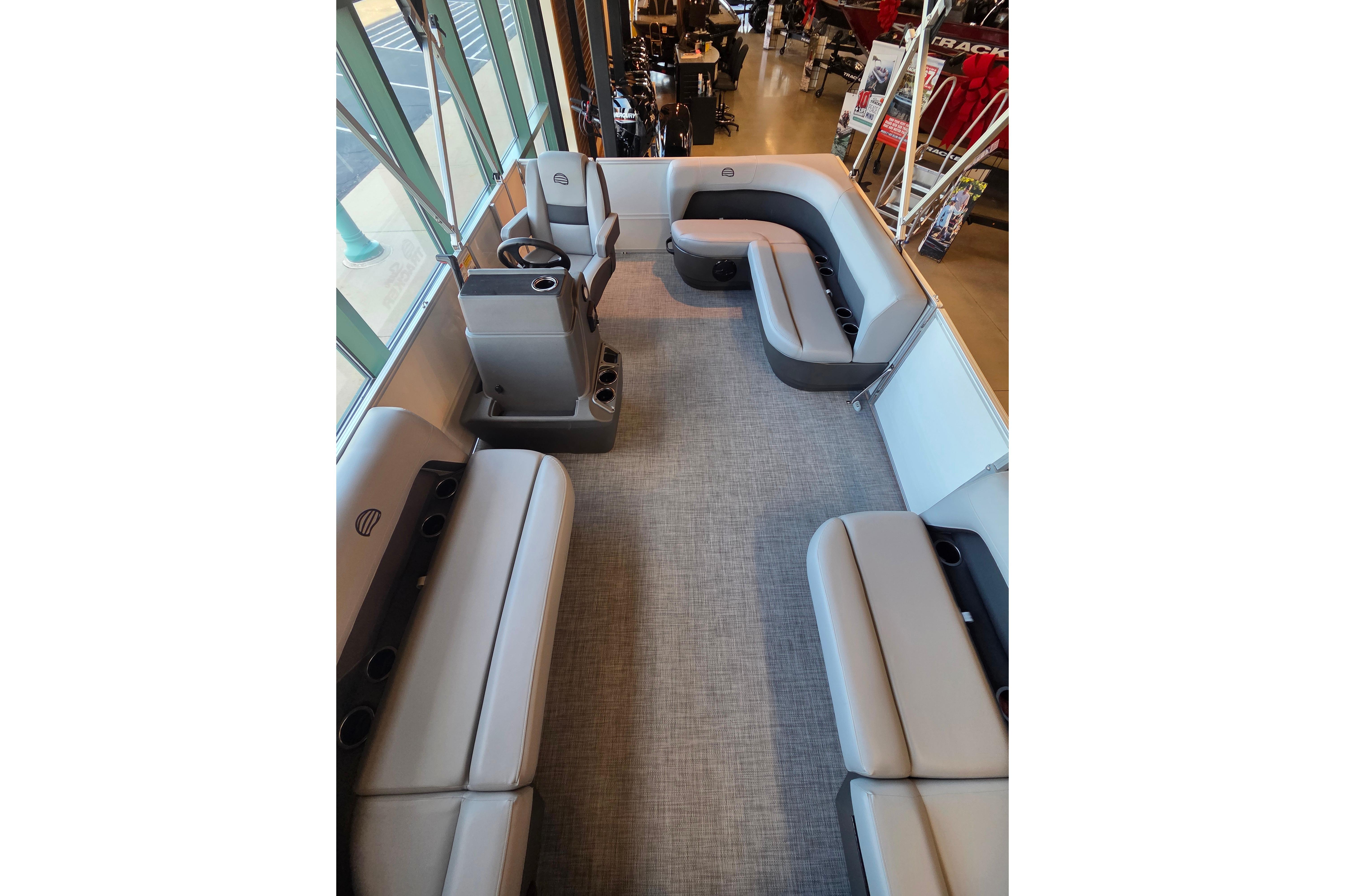 This year's PARTY BARGE gets some slick upgrades. Extra cupholders and storage built into the lounge backrests and improved handles make keeping your supplies at hand easier than ever. A new driver console design creates extra style. The boarding ladder has wider, more ergonomic steps. Crank up the soundtrack of the summer with the standard Bluetooth®-capable Wet Sounds™ stereo and pull up the 7' bimini top to party in the shade when the sun is high. Find your corner of the lake and relax in one of the three corner lounges.