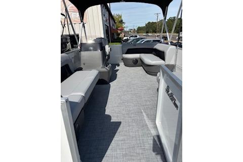This year's PARTY BARGE gets some slick upgrades. Extra cupholders and storage built into the lounge backrests and improved handles make keeping your supplies at hand easier than ever. A new driver console design creates extra style. The boarding ladder has wider, more ergonomic steps. Crank up the soundtrack of the summer with the standard Bluetooth®-capable Wet Sounds™ stereo and pull up the 7' bimini top to party in the shade when the sun is high. Find your corner of the lake and relax in one of the three corner lounges.