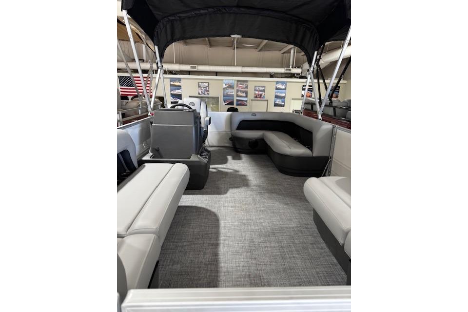 This year's PARTY BARGE gets some slick upgrades. Extra cupholders and storage built into the lounge backrests and improved handles make keeping your supplies at hand easier than ever. A new driver console design creates extra style. The boarding ladder has wider, more ergonomic steps. Crank up the soundtrack of the summer with the standard Bluetooth®-capable Wet Sounds™ stereo and pull up the 7' bimini top to party in the shade when the sun is high. Find your corner of the lake and relax in one of the three corner lounges.