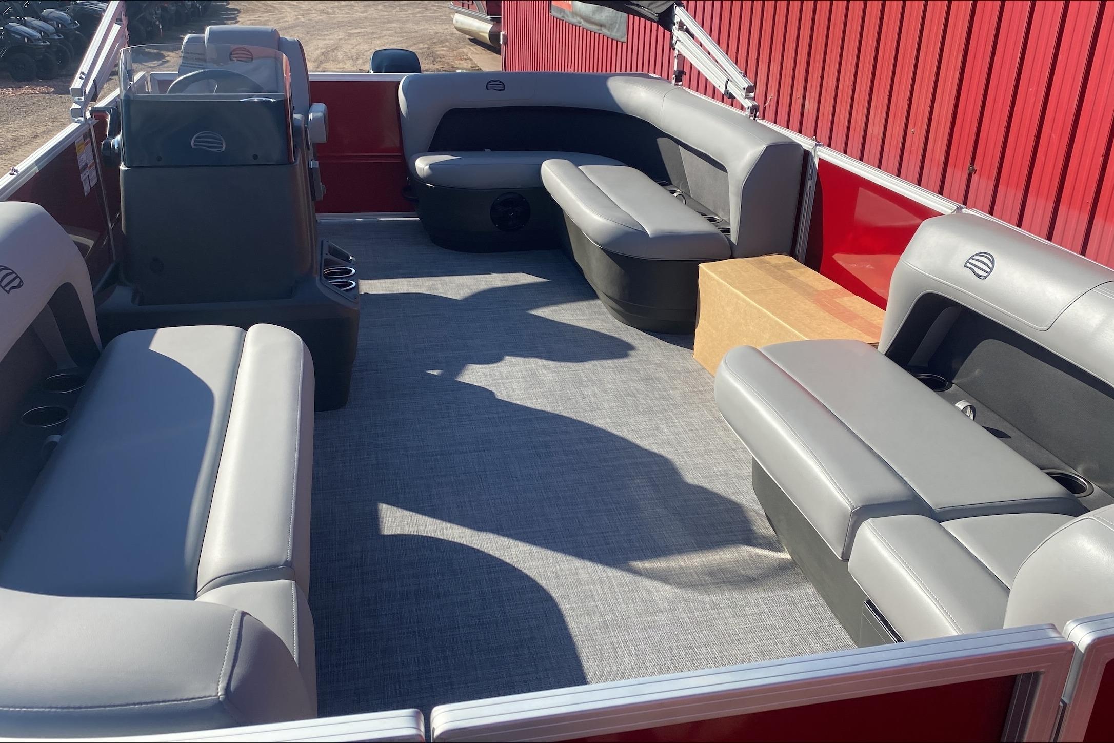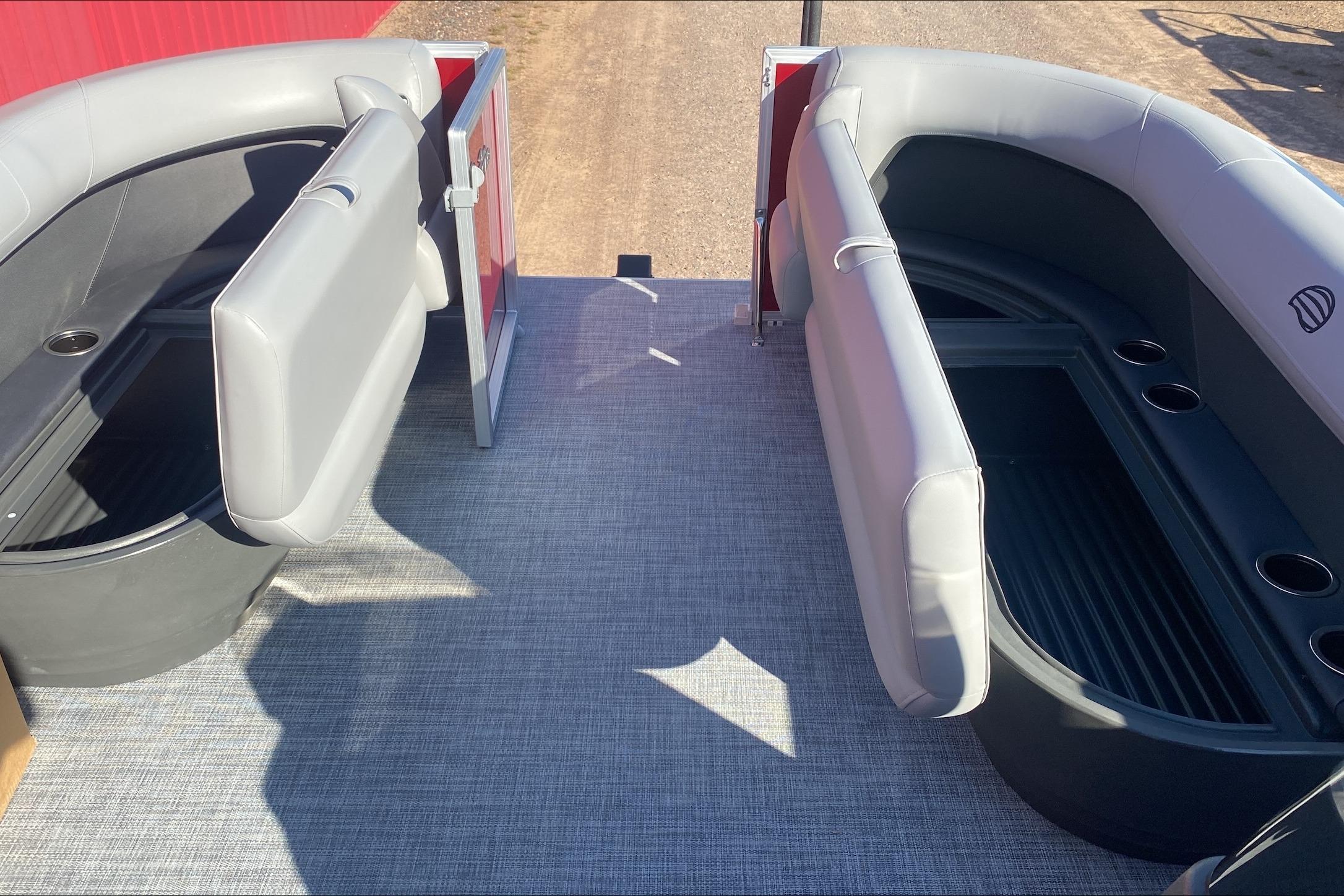 This year's PARTY BARGE gets some slick upgrades. Extra cupholders and storage built into the lounge backrests and improved handles make keeping your supplies at hand easier than ever. A new driver console design creates extra style. The boarding ladder has wider, more ergonomic steps. Crank up the soundtrack of the summer with the standard Bluetooth®-capable Wet Sounds™ stereo and pull up the 7' bimini top to party in the shade when the sun is high. Find your corner of the lake and relax in one of the three corner lounges.