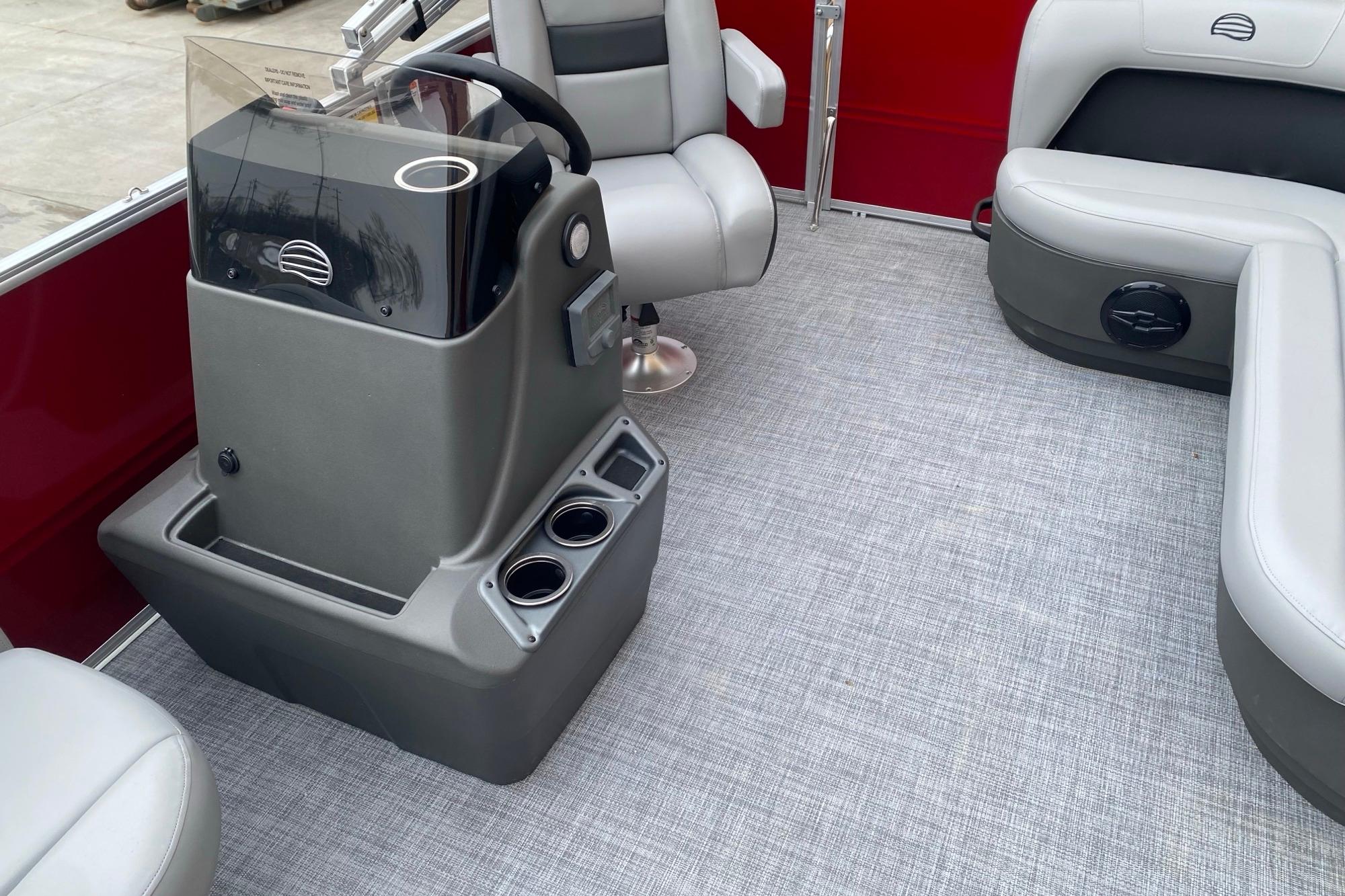 This year's PARTY BARGE gets some slick upgrades. Extra cupholders and storage built into the lounge backrests and improved handles make keeping your supplies at hand easier than ever. A new driver console design creates extra style. The boarding ladder has wider, more ergonomic steps. Crank up the soundtrack of the summer with the standard Bluetooth®-capable Wet Sounds™ stereo and pull up the 7' bimini top to party in the shade when the sun is high. Find your corner of the lake and relax in one of the three corner lounges.