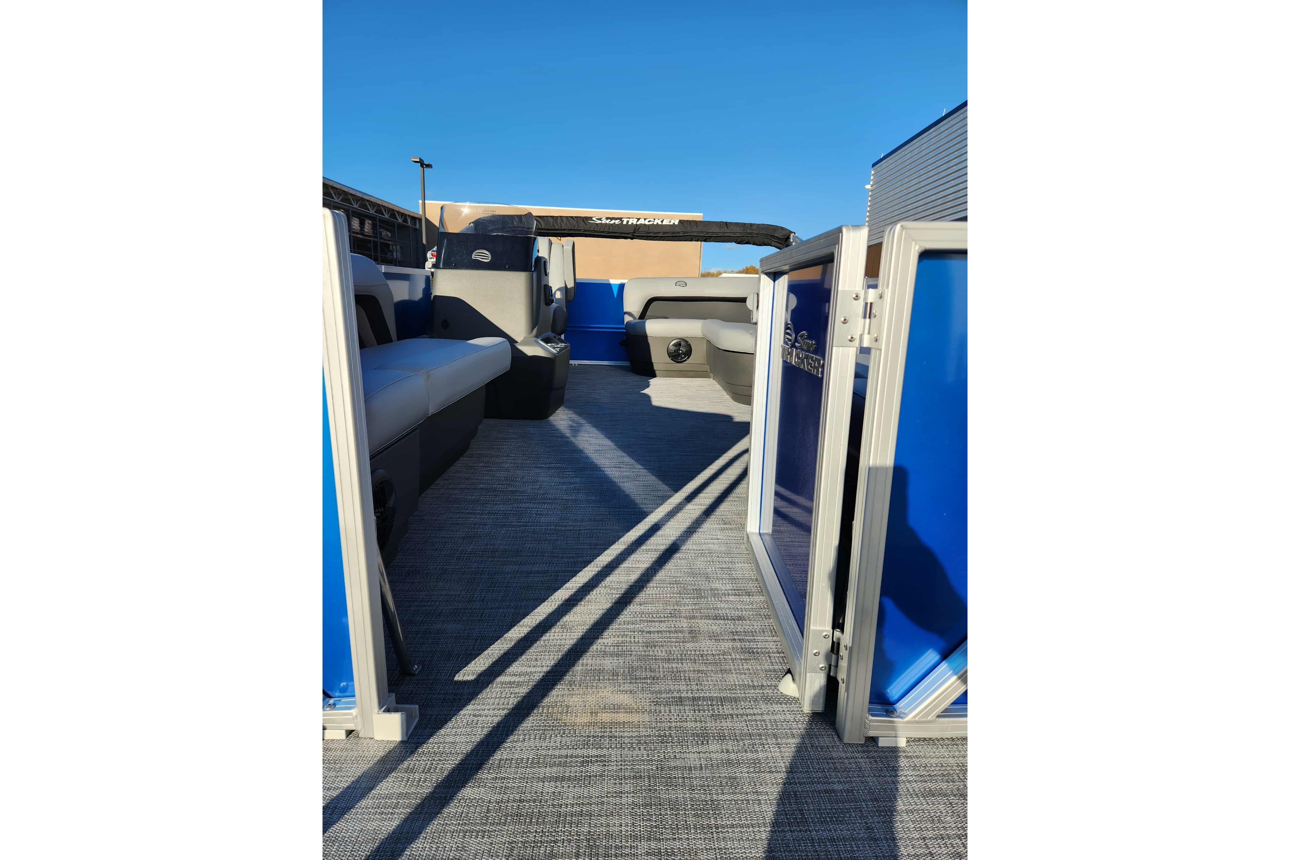 This year's PARTY BARGE gets some slick upgrades. Extra cupholders and storage built into the lounge backrests and improved handles make keeping your supplies at hand easier than ever. A new driver console design creates extra style. The boarding ladder has wider, more ergonomic steps. Crank up the soundtrack of the summer with the standard Bluetooth®-capable Wet Sounds™ stereo and pull up the 7' bimini top to party in the shade when the sun is high. Find your corner of the lake and relax in one of the three corner lounges.