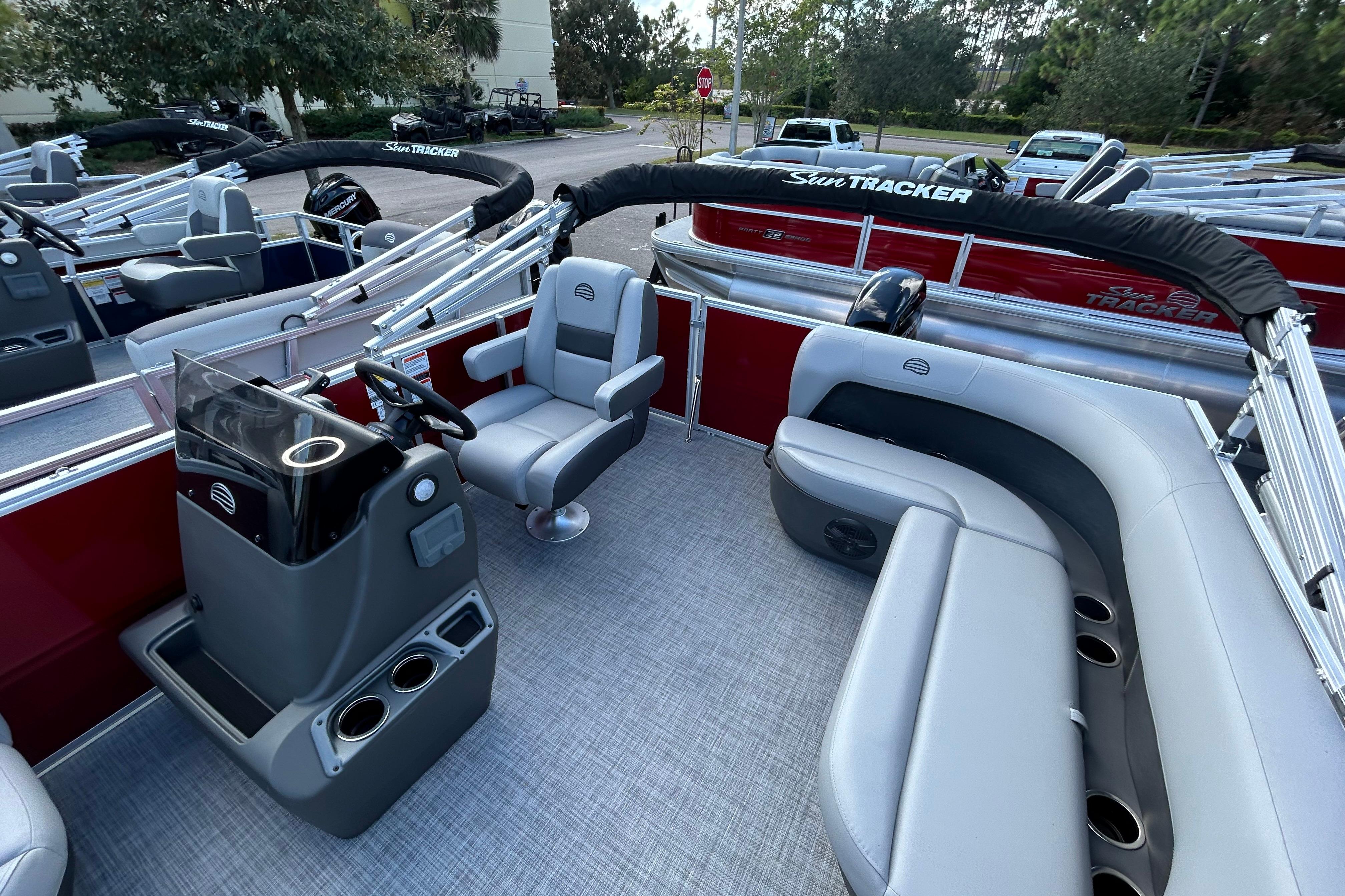 This year's PARTY BARGE gets some slick upgrades. Extra cupholders and storage built into the lounge backrests and improved handles make keeping your supplies at hand easier than ever. A new driver console design creates extra style. The boarding ladder has wider, more ergonomic steps. Crank up the soundtrack of the summer with the standard Bluetooth®-capable Wet Sounds™ stereo and pull up the 7' bimini top to party in the shade when the sun is high. Find your corner of the lake and relax in one of the three corner lounges.