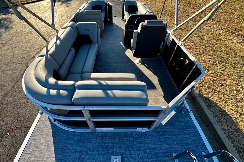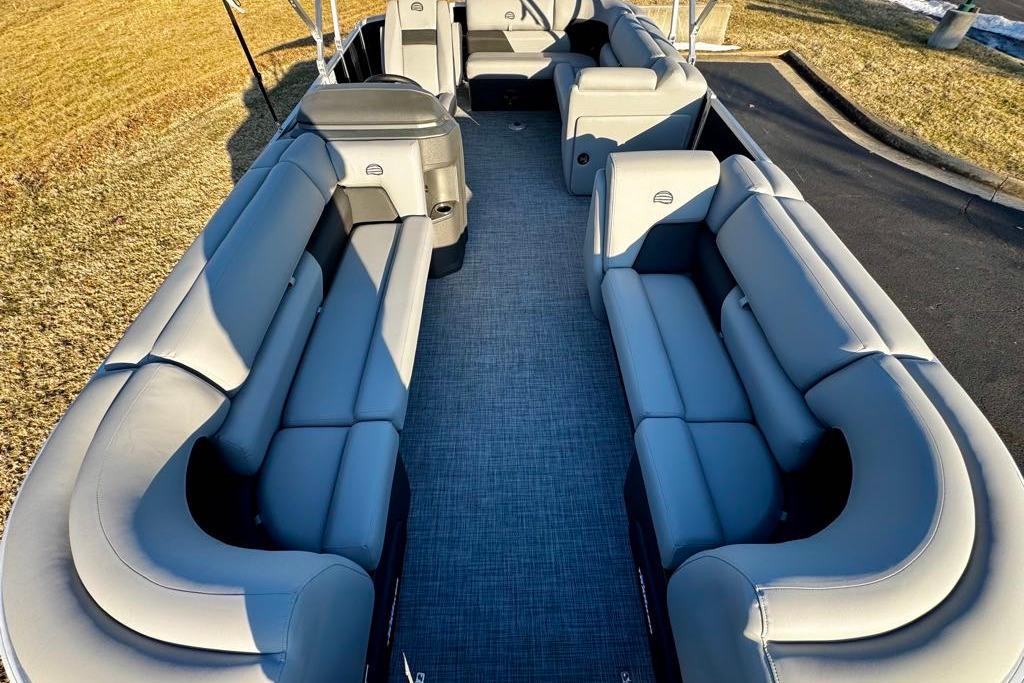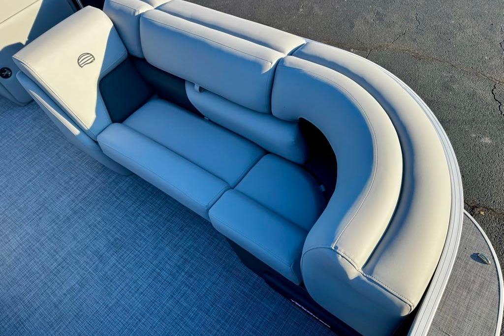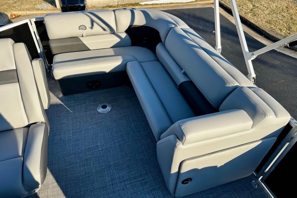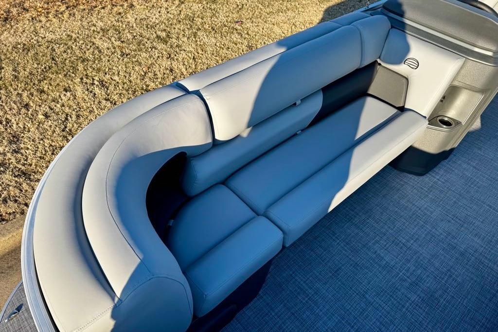 Some exciting new changes come with the 2026 model! The captain's console has received a complete facelift. The three corner lounges give your passengers plenty of space to relax in. These lounges have new accents that match the fence colors and also sport great new corner storage cubbies with more cupholders. Lift those pillow-top seats to reveal hidden storage compartments.