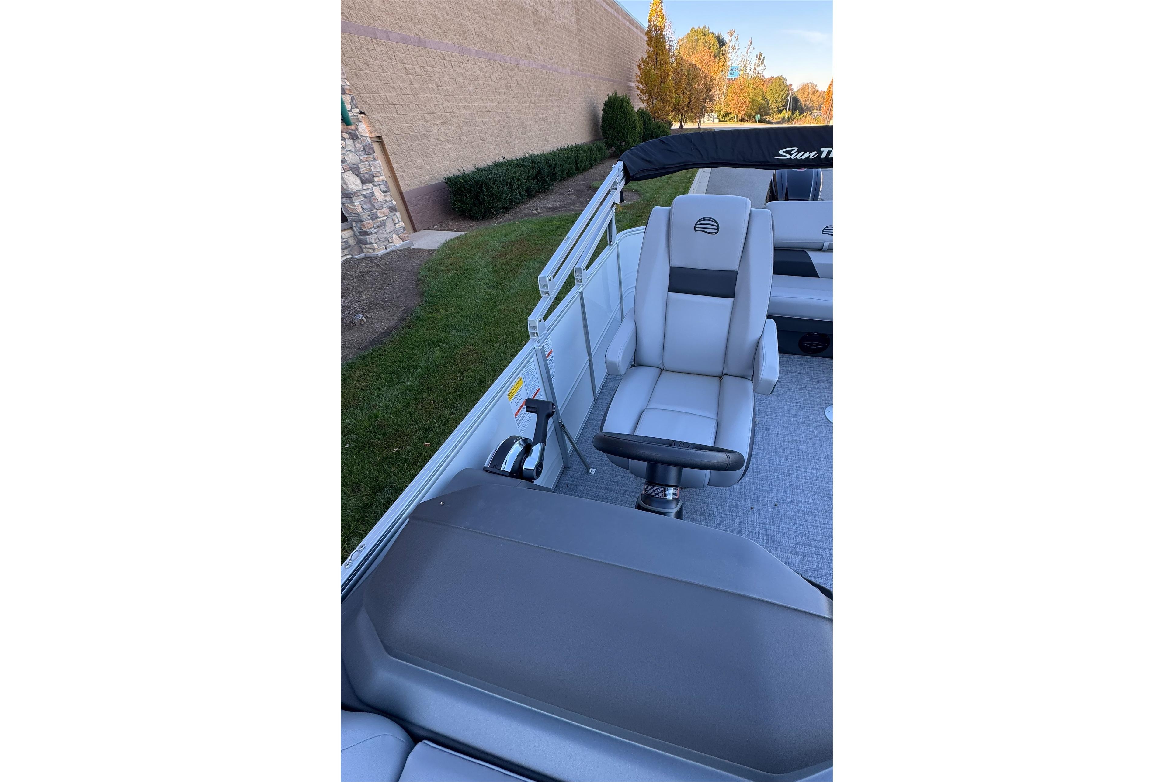 • Reclining, high-back swiveling helm bucket seat w/self-leveling armrests