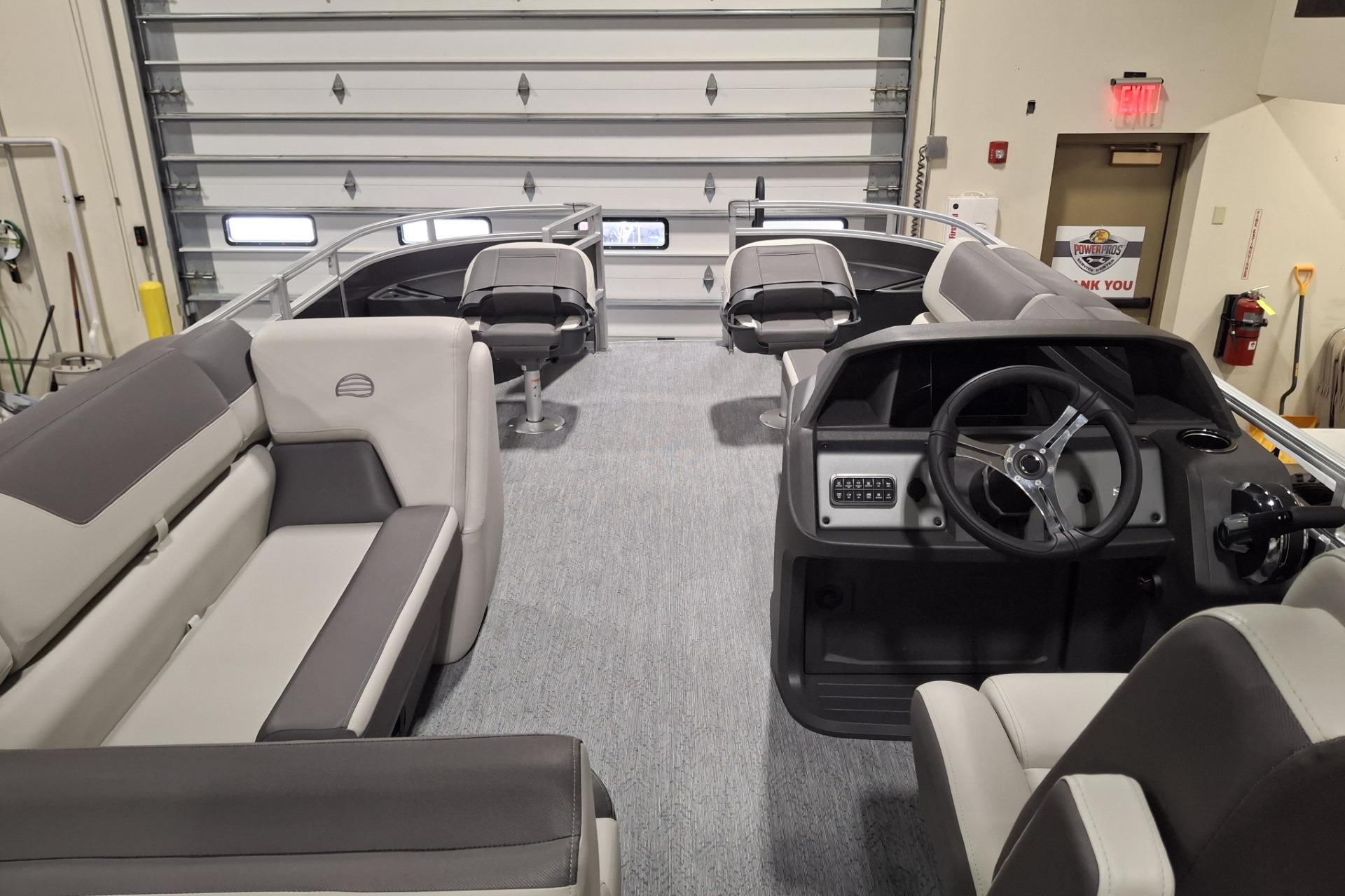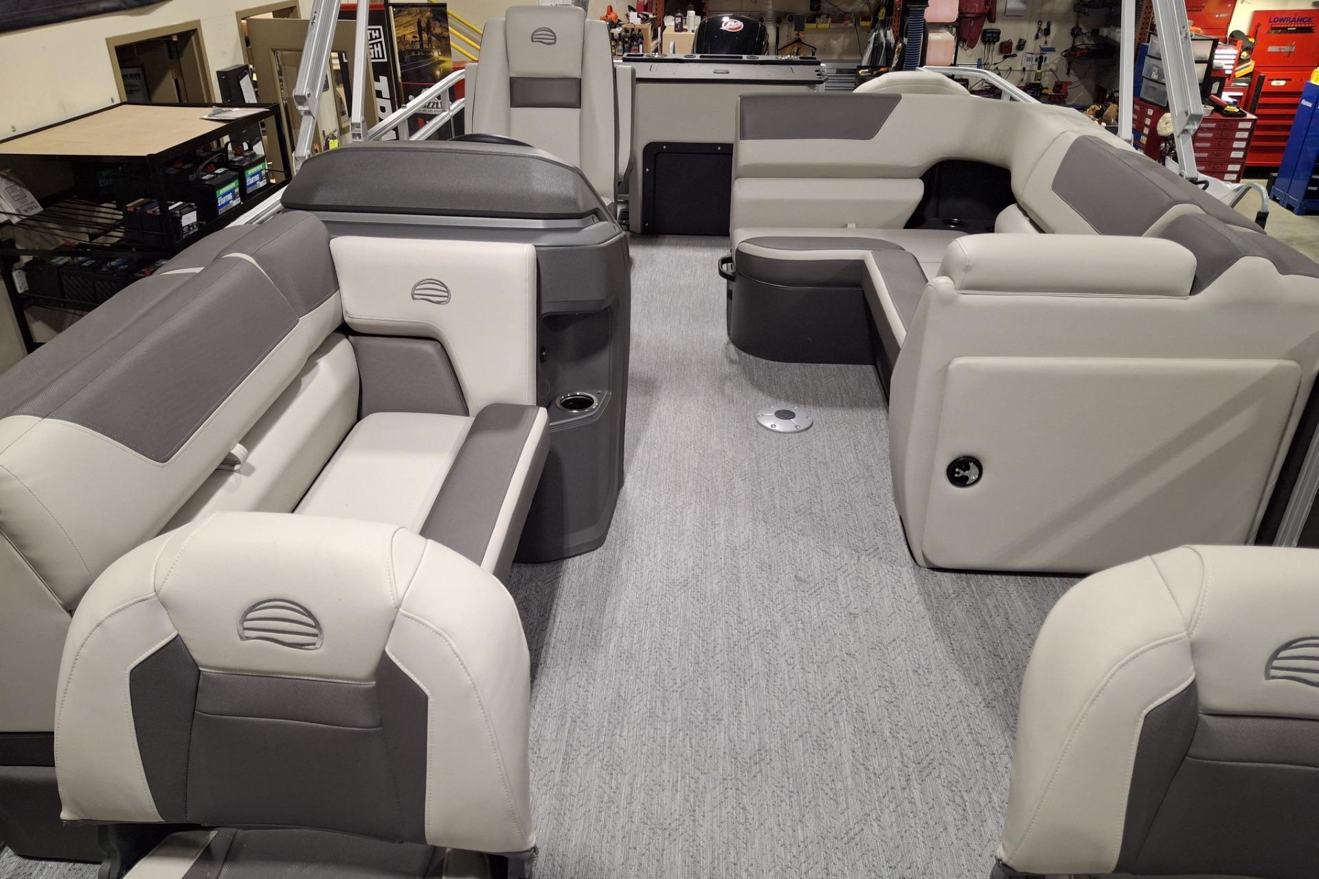 Some exciting new changes come with the 2026 model! The captain's console has received a complete facelift. The three corner lounges give your passengers plenty of space to relax in. These lounges have new accents that match the fence colors and also sport great new corner storage cubbies with more cupholders. Lift those pillow-top seats to reveal hidden storage compartments.
