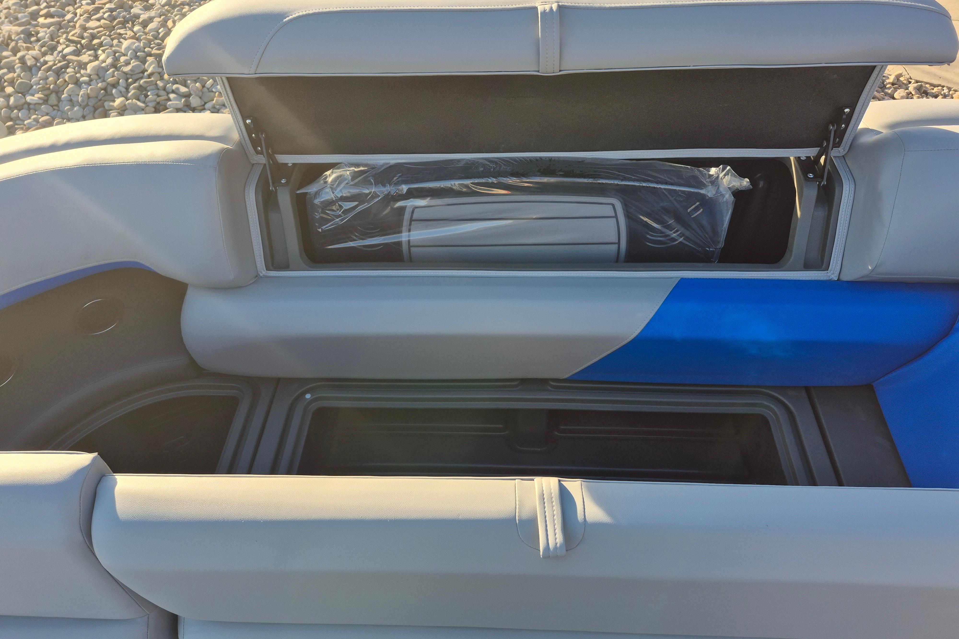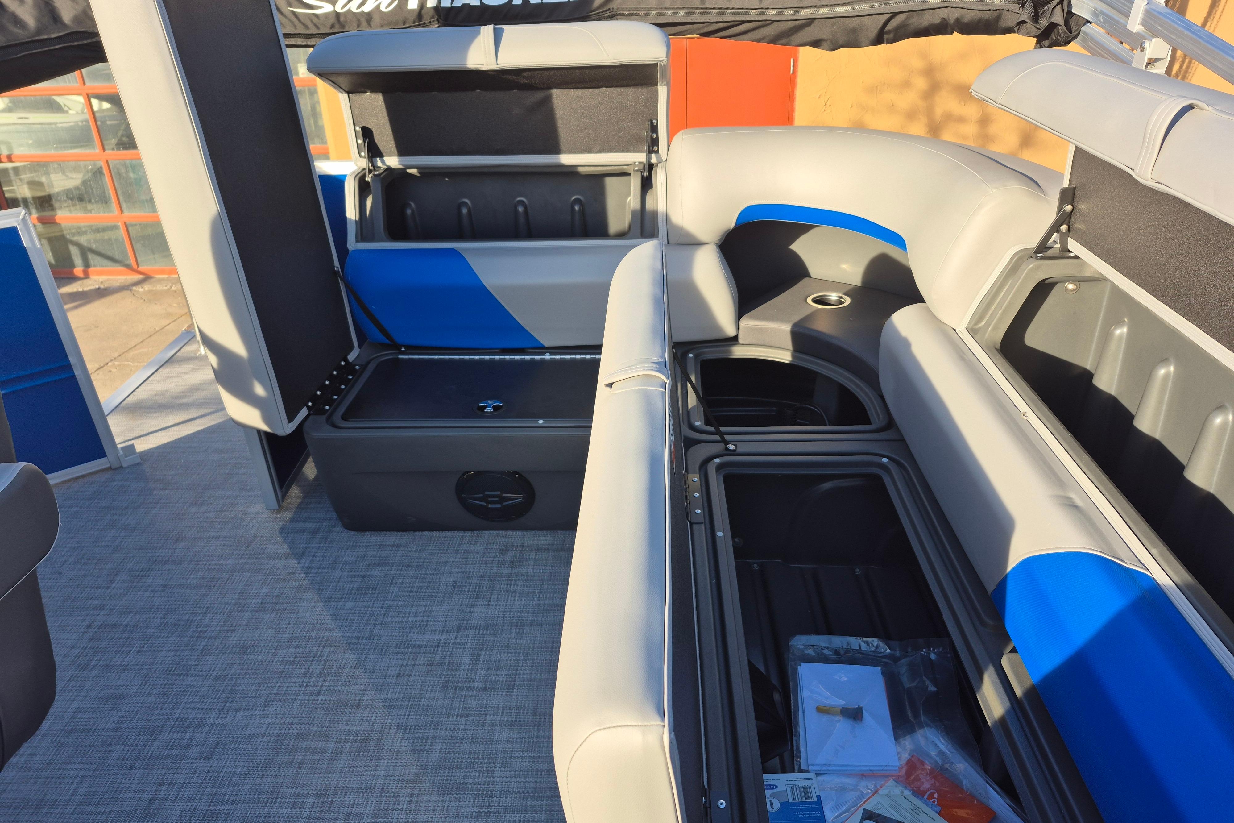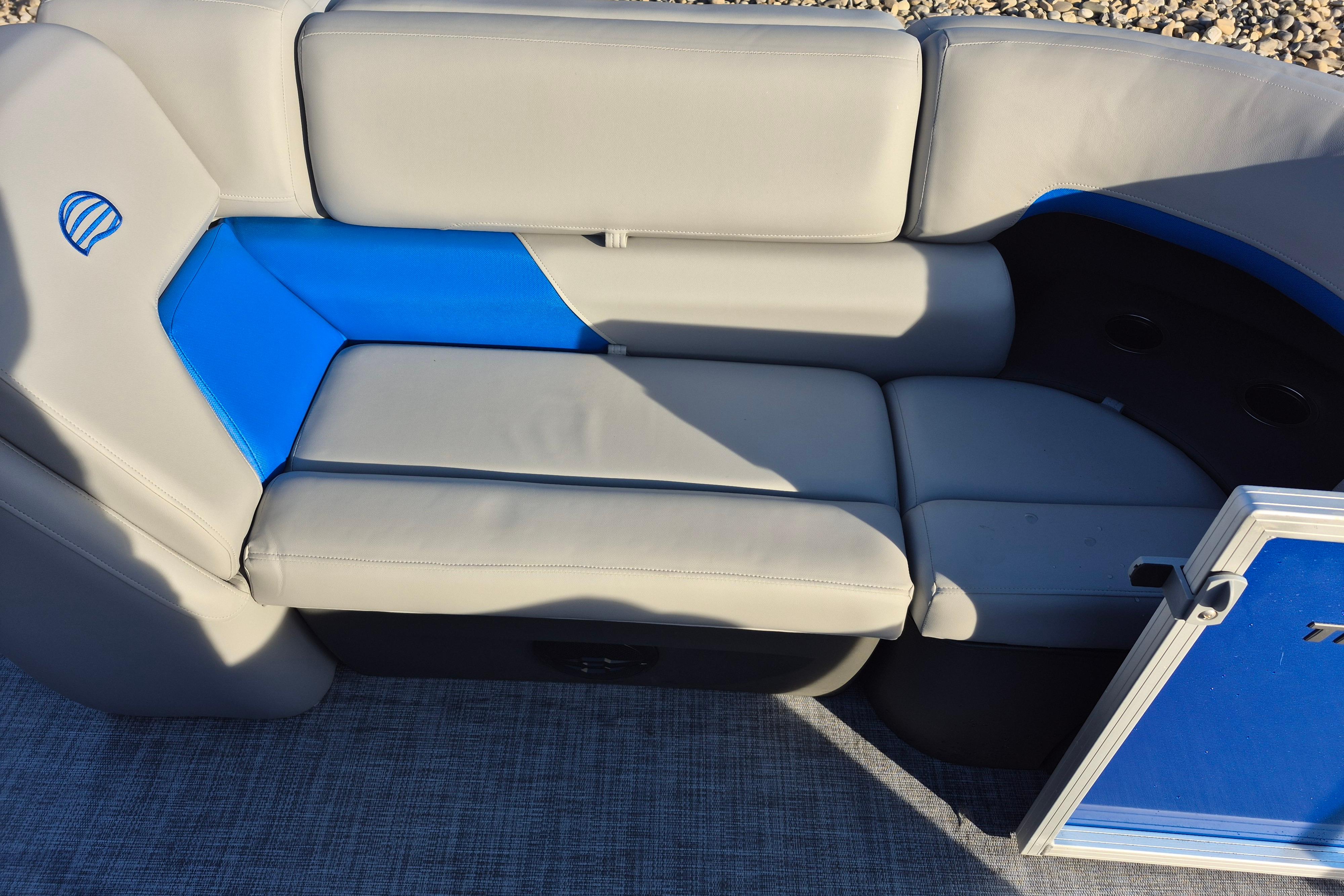 Some exciting new changes come with the 2026 model! The captain's console has received a complete facelift. The three corner lounges give your passengers plenty of space to relax in. These lounges have new accents that match the fence colors and also sport great new corner storage cubbies with more cupholders. Lift those pillow-top seats to reveal hidden storage compartments.