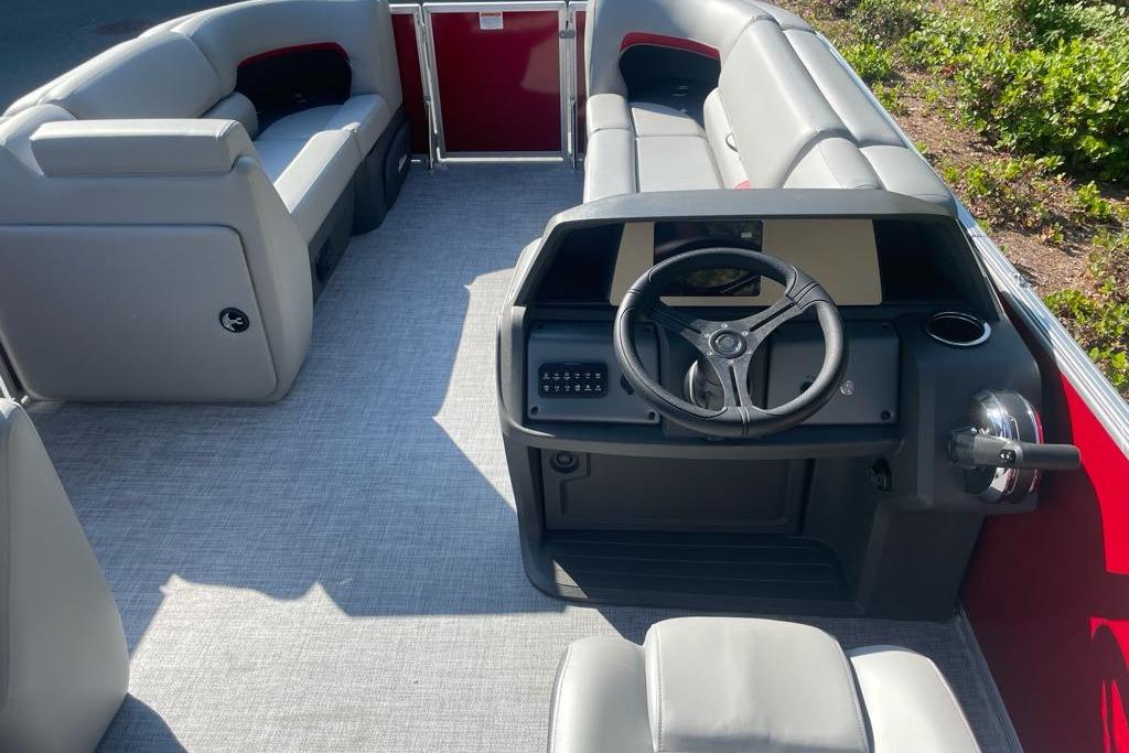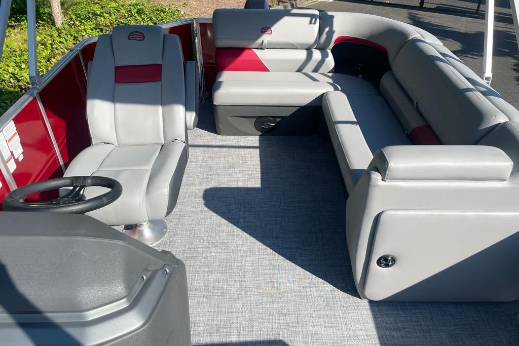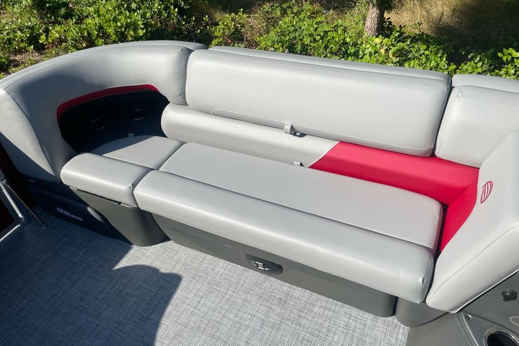 Some exciting new changes come with the 2026 model! The captain's console has received a complete facelift. The three corner lounges give your passengers plenty of space to relax in. These lounges have new accents that match the fence colors and also sport great new corner storage cubbies with more cupholders. Lift those pillow-top seats to reveal hidden storage compartments.