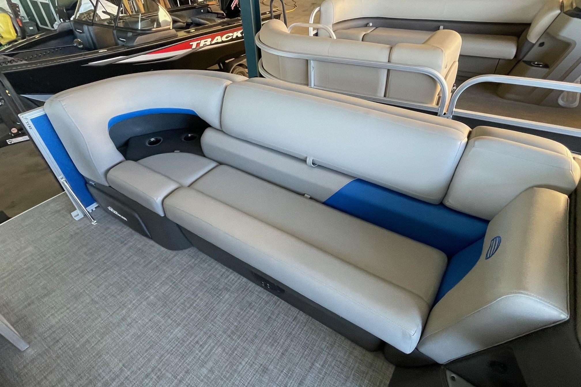 Some exciting new changes come with the 2026 model! The captain's console has received a complete facelift. The three corner lounges give your passengers plenty of space to relax in. These lounges have new accents that match the fence colors and also sport great new corner storage cubbies with more cupholders. Lift those pillow-top seats to reveal hidden storage compartments.