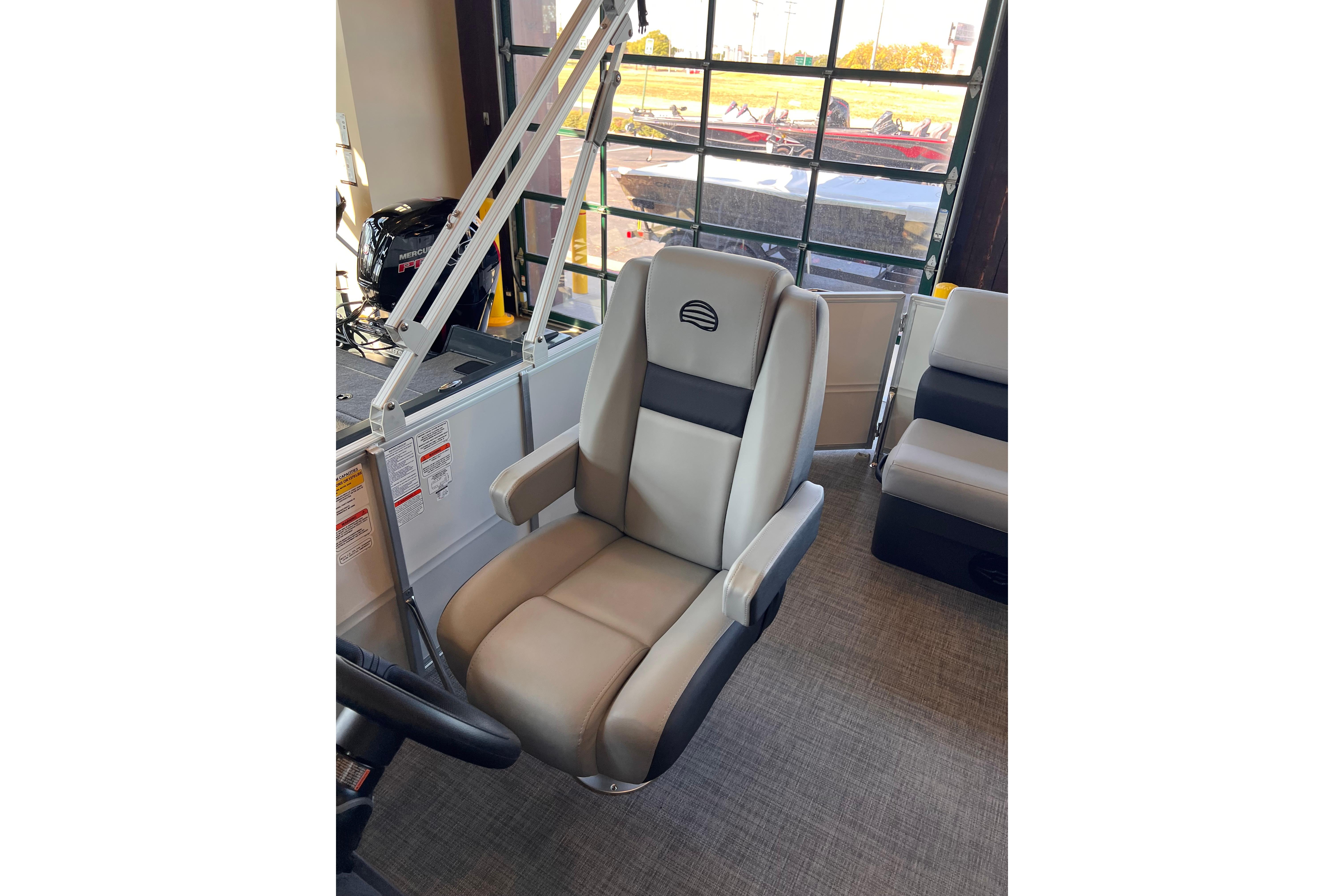 • Reclining, high-back swiveling helm bucket seat w/self-leveling armrests