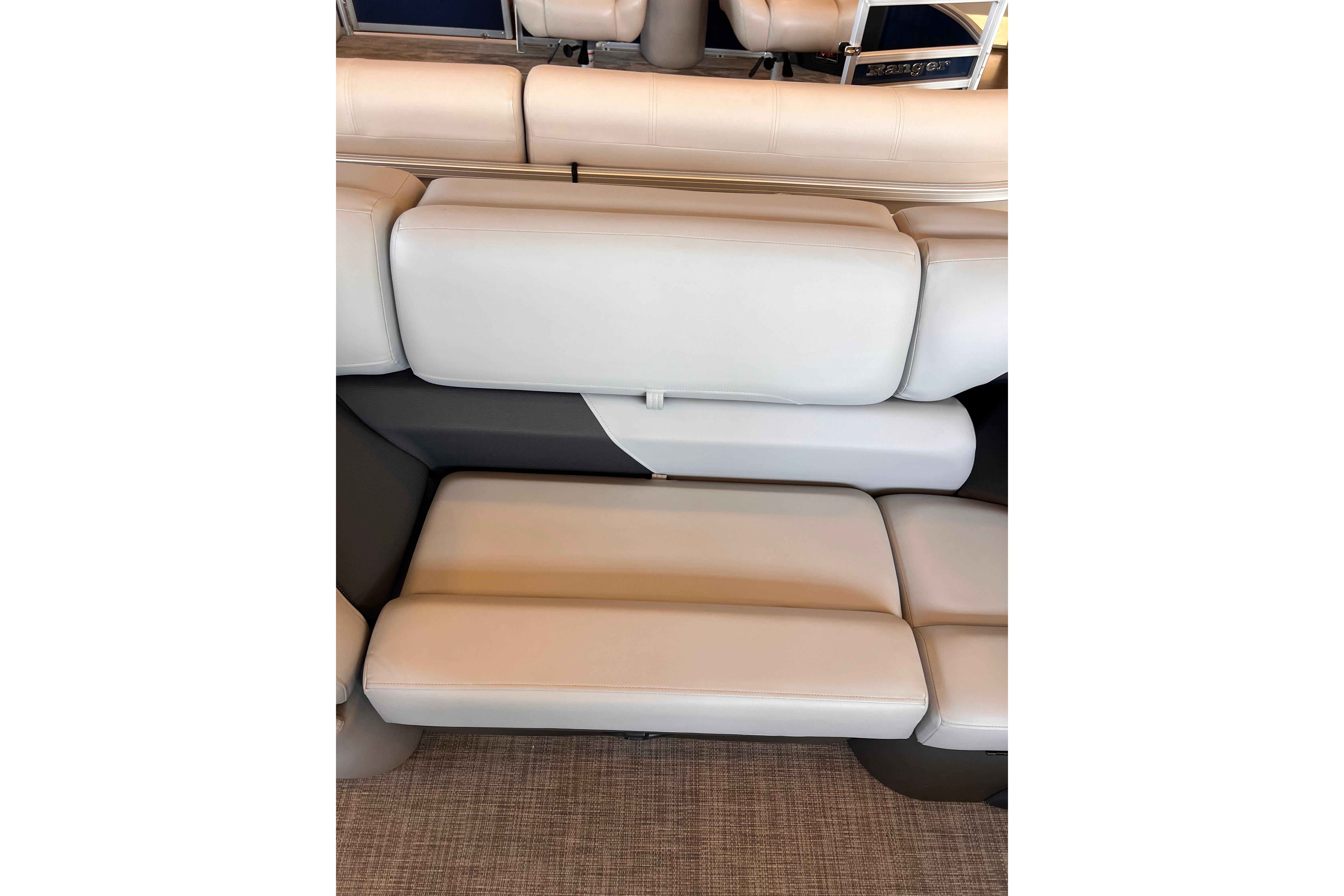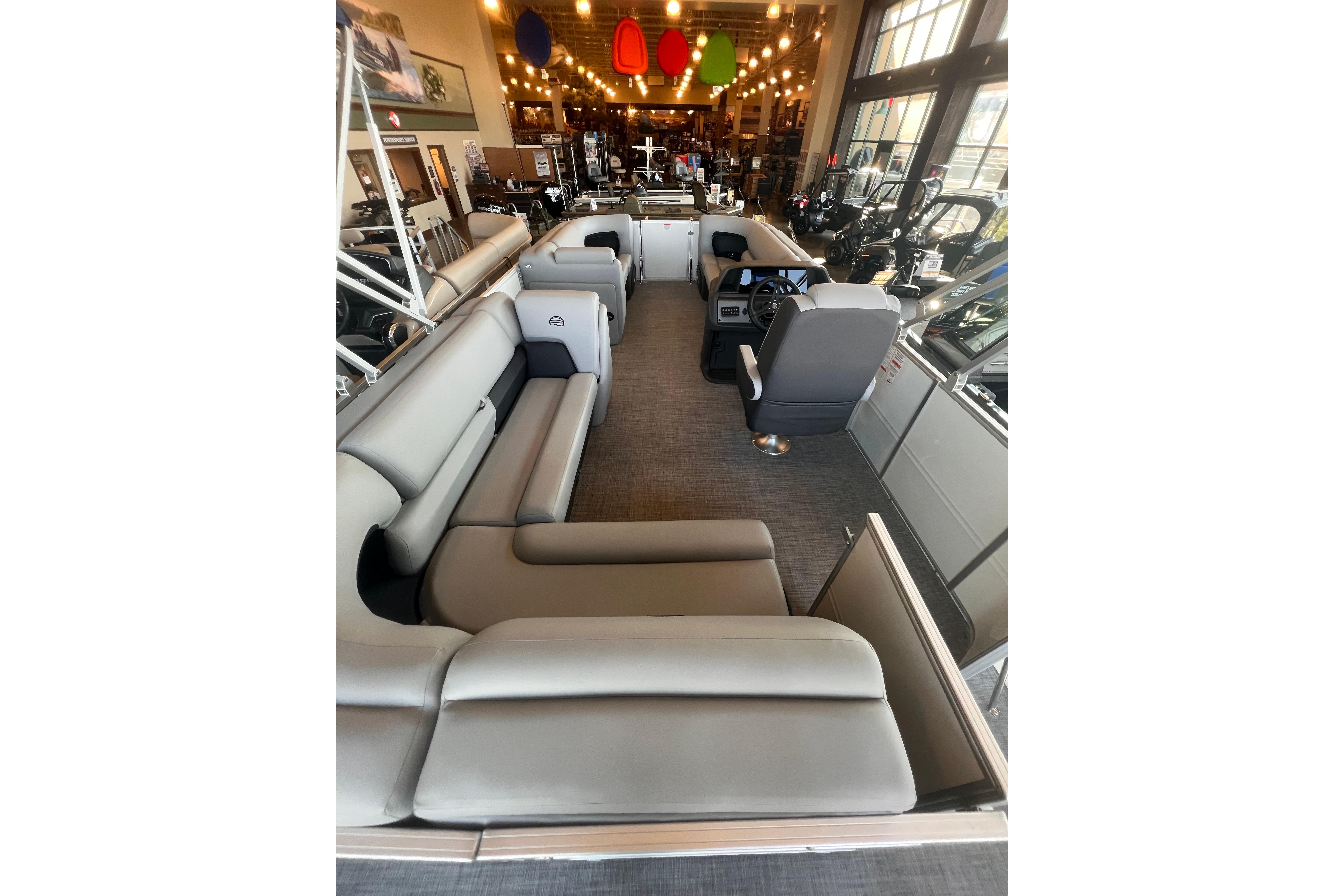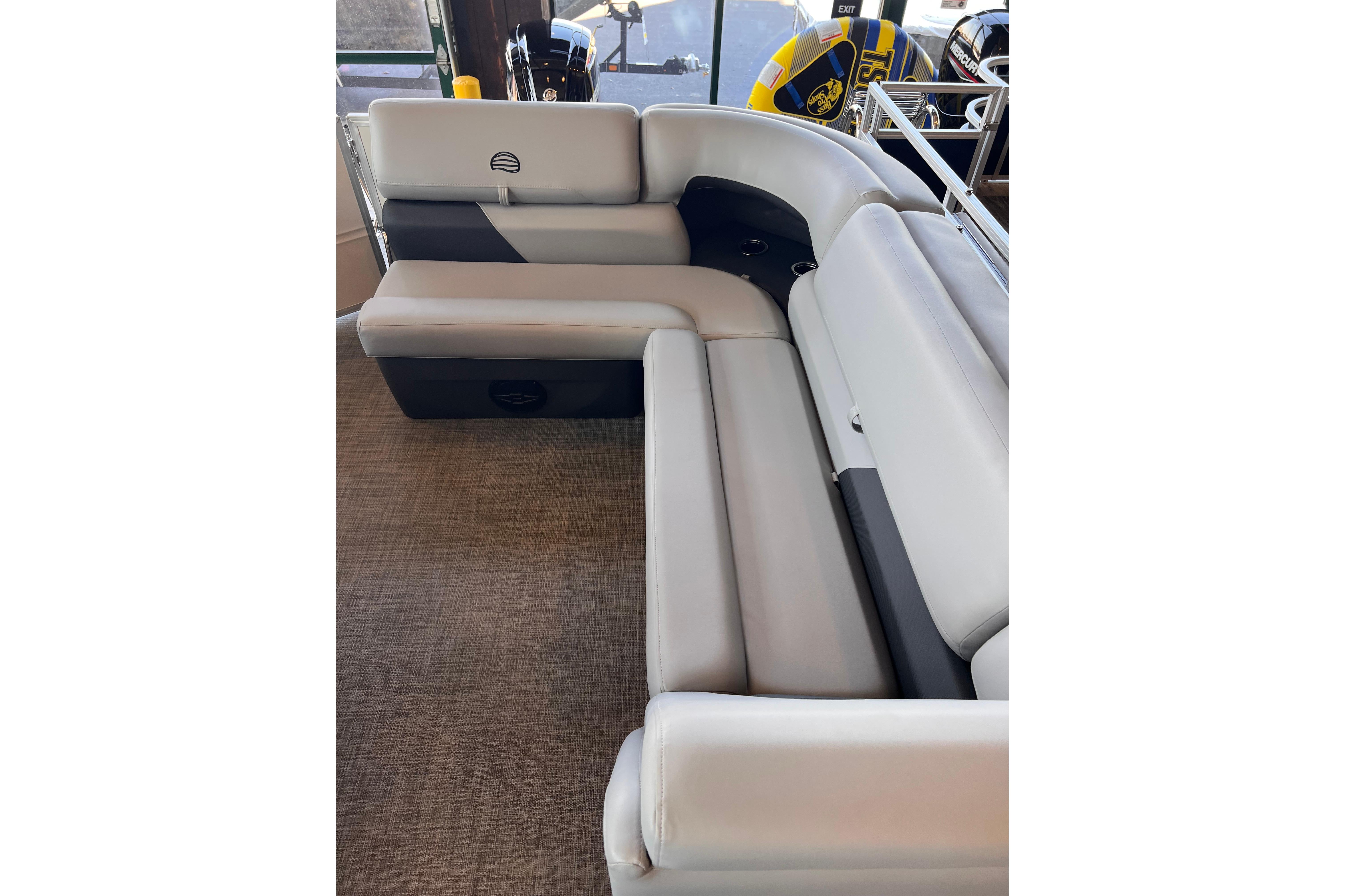 Some exciting new changes come with the 2026 model! The captain's console has received a complete facelift. The three corner lounges give your passengers plenty of space to relax in. These lounges have new accents that match the fence colors and also sport great new corner storage cubbies with more cupholders. Lift those pillow-top seats to reveal hidden storage compartments.