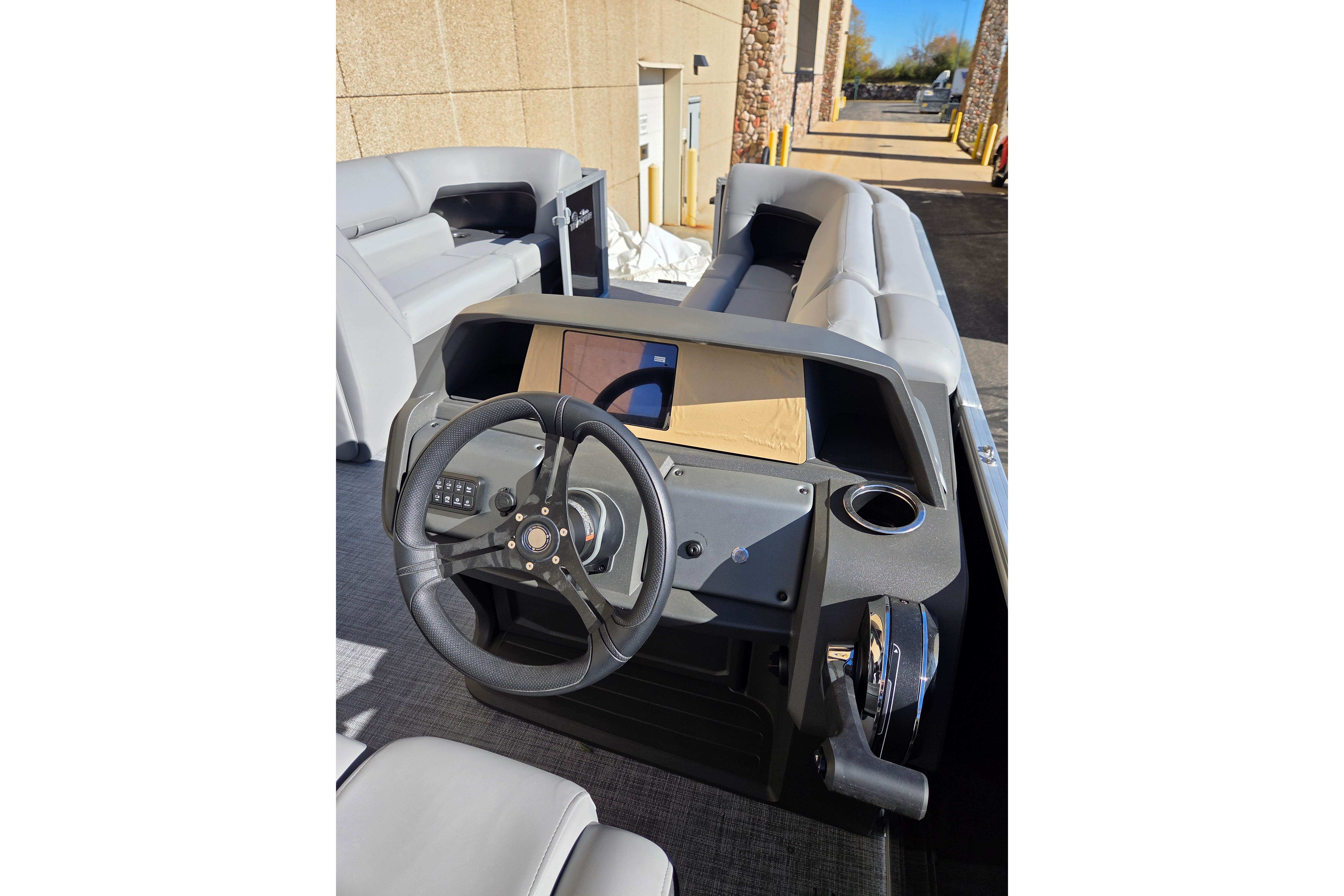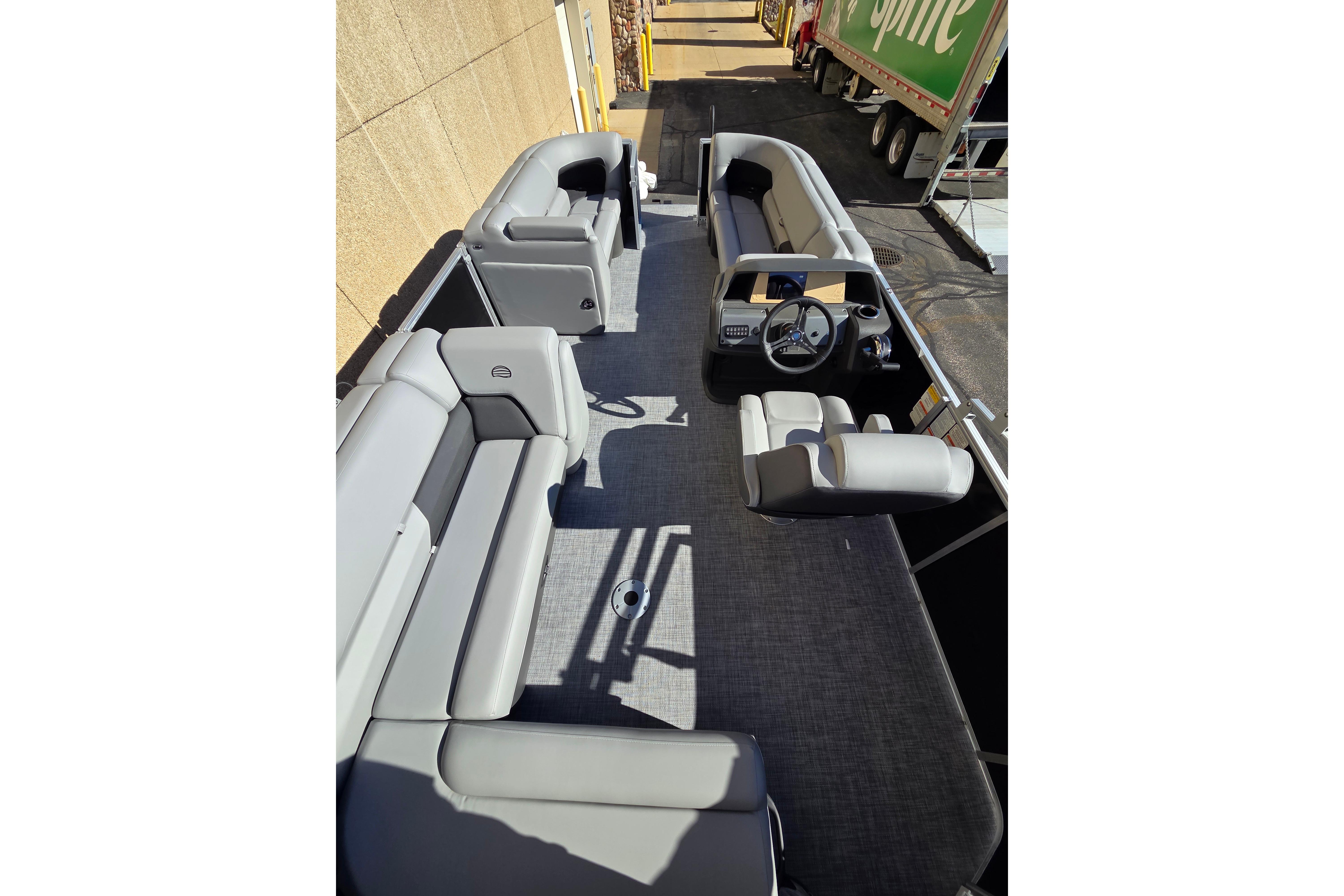 Some exciting new changes come with the 2026 model! The captain's console has received a complete facelift. The three corner lounges give your passengers plenty of space to relax in. These lounges have new accents that match the fence colors and also sport great new corner storage cubbies with more cupholders. Lift those pillow-top seats to reveal hidden storage compartments.