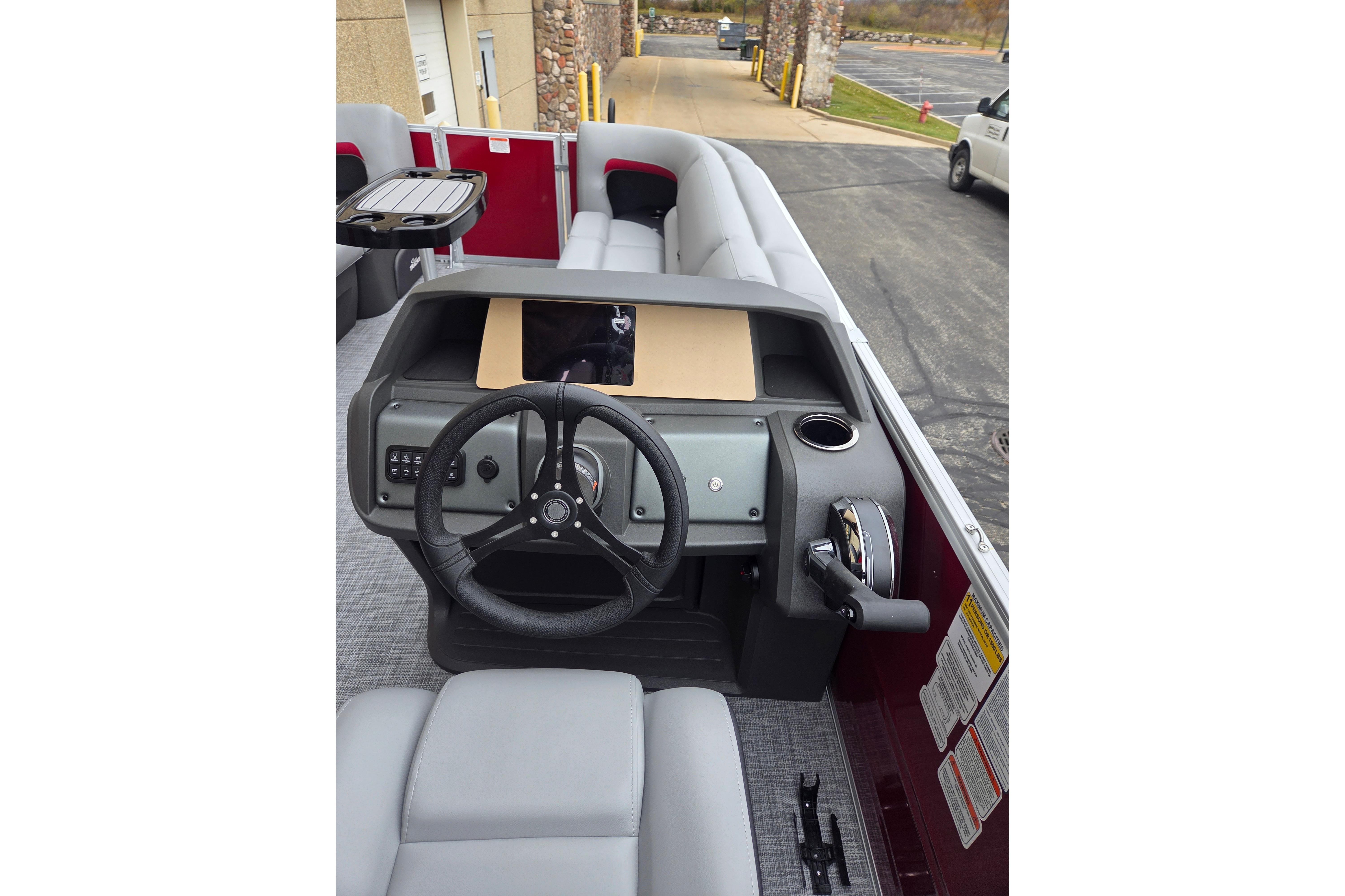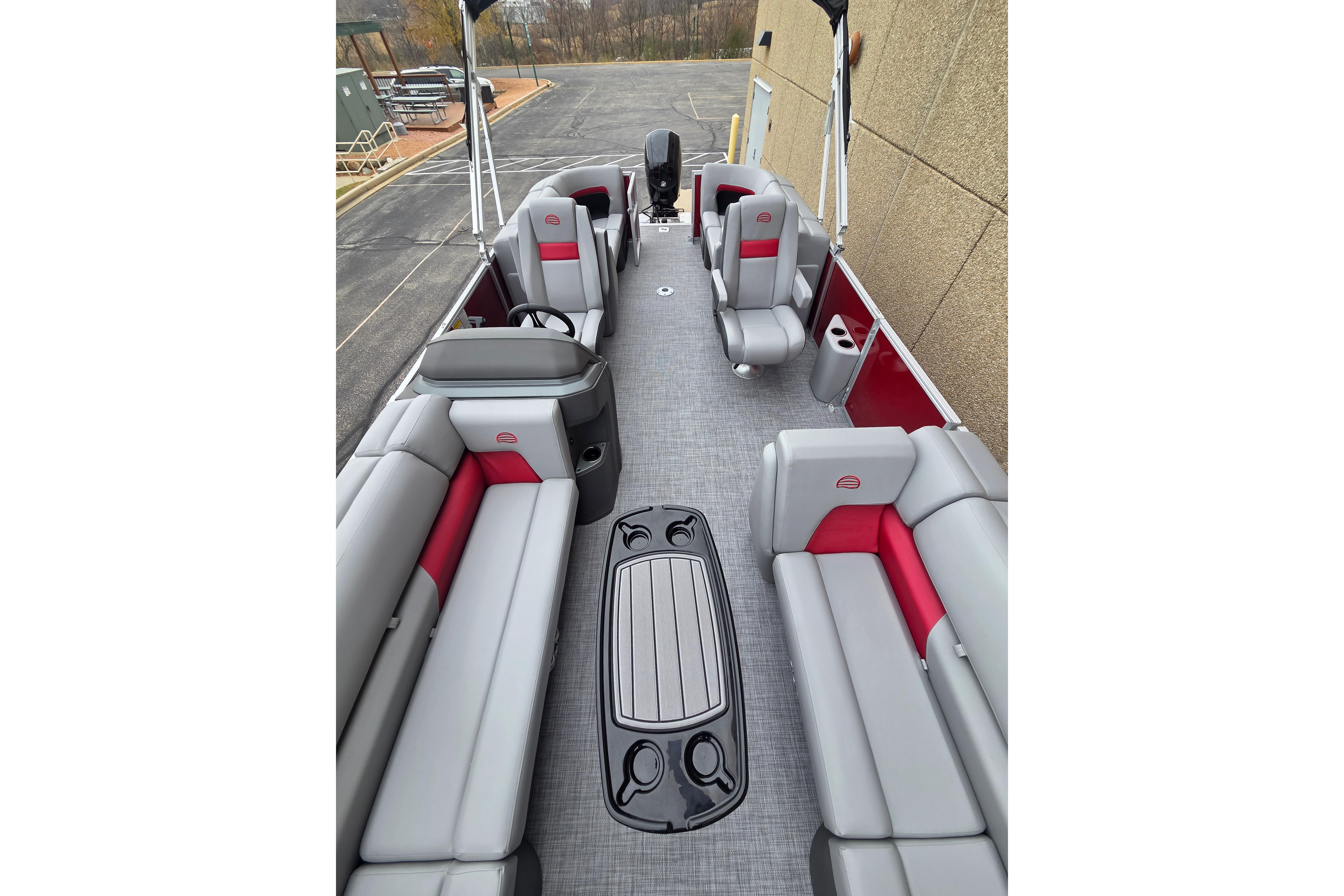 The 22 DLX gets an all-new interior loaded with comfortable seating for the 2026 model year. The four wraparound lounges have bright new accents that match the fence color and now feature cut-out sections in the backrest that offer more storage space and cupholders. Stow supplies under the seats and in the seat-back STOW MORE™ hidden compartments. The captain's console has also received a full redesign with upgraded tech. Even the flooring has been upgraded with a sophisticated and clean weave. Also new for 2026 is a wider, more ergonomic four-step boarding ladder that makes getting back into the boat easier.