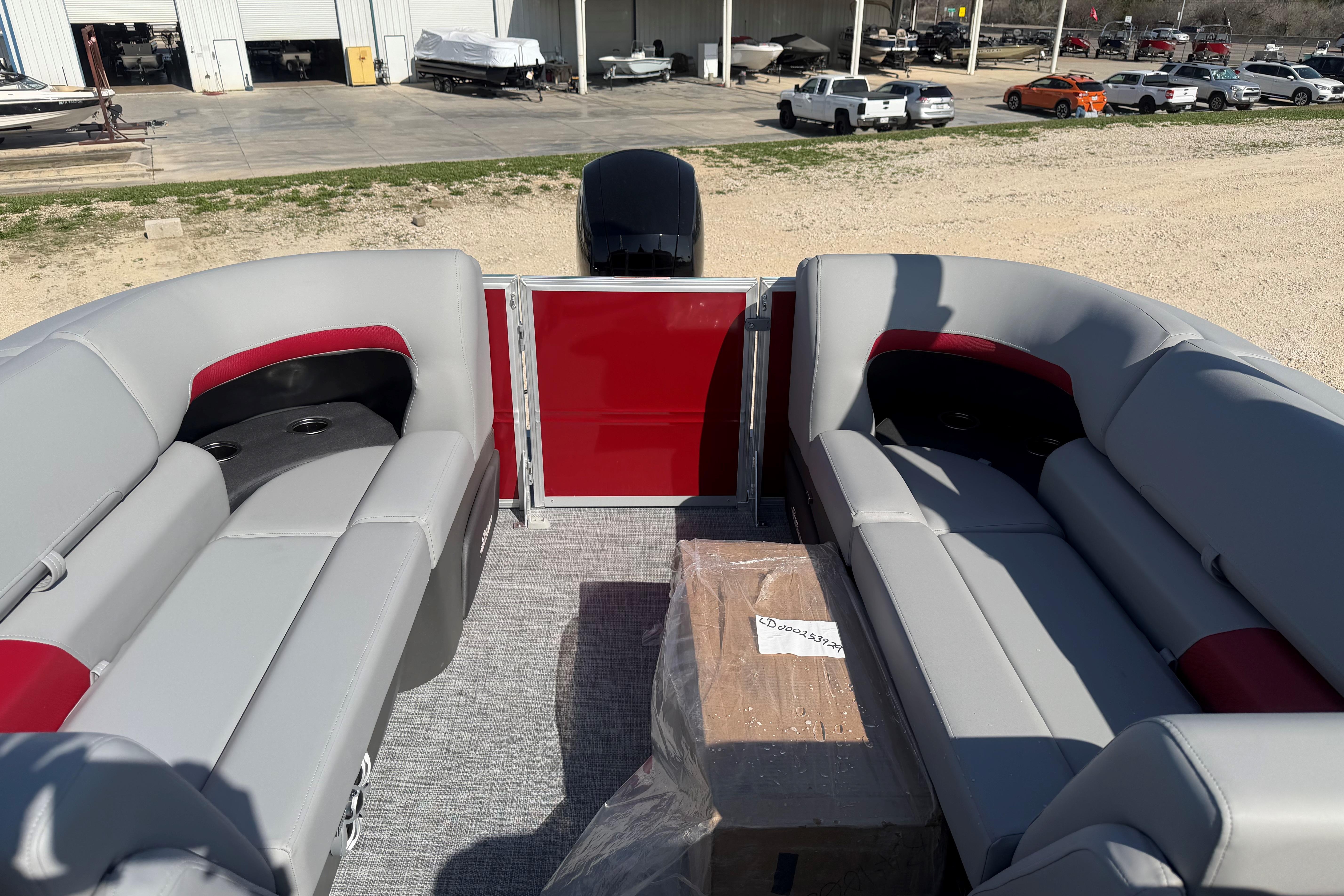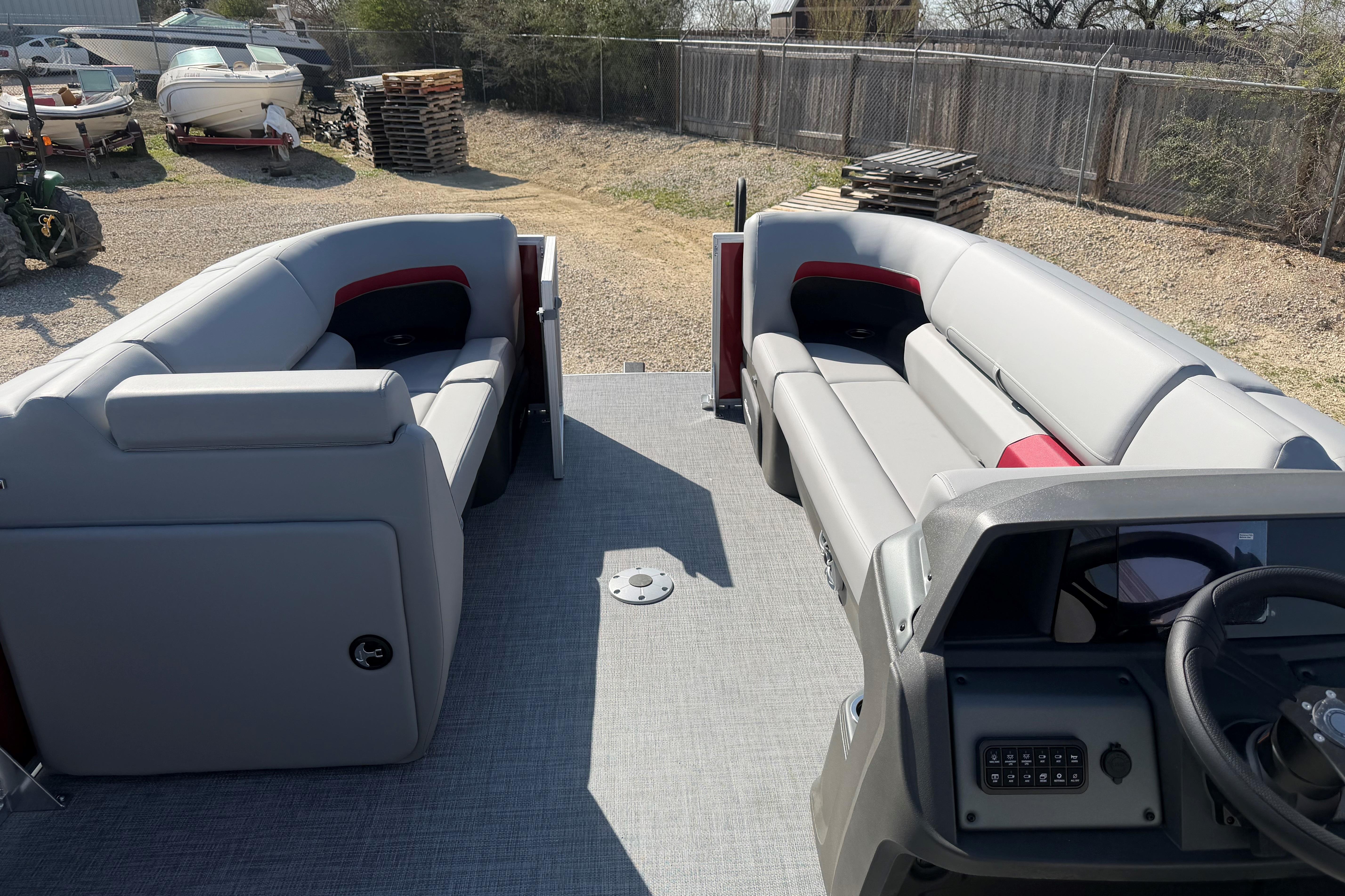 The 22 DLX gets an all-new interior loaded with comfortable seating for the 2026 model year. The four wraparound lounges have bright new accents that match the fence color and now feature cut-out sections in the backrest that offer more storage space and cupholders. Stow supplies under the seats and in the seat-back STOW MORE™ hidden compartments. The captain's console has also received a full redesign with upgraded tech. Even the flooring has been upgraded with a sophisticated and clean weave. Also new for 2026 is a wider, more ergonomic four-step boarding ladder that makes getting back into the boat easier.