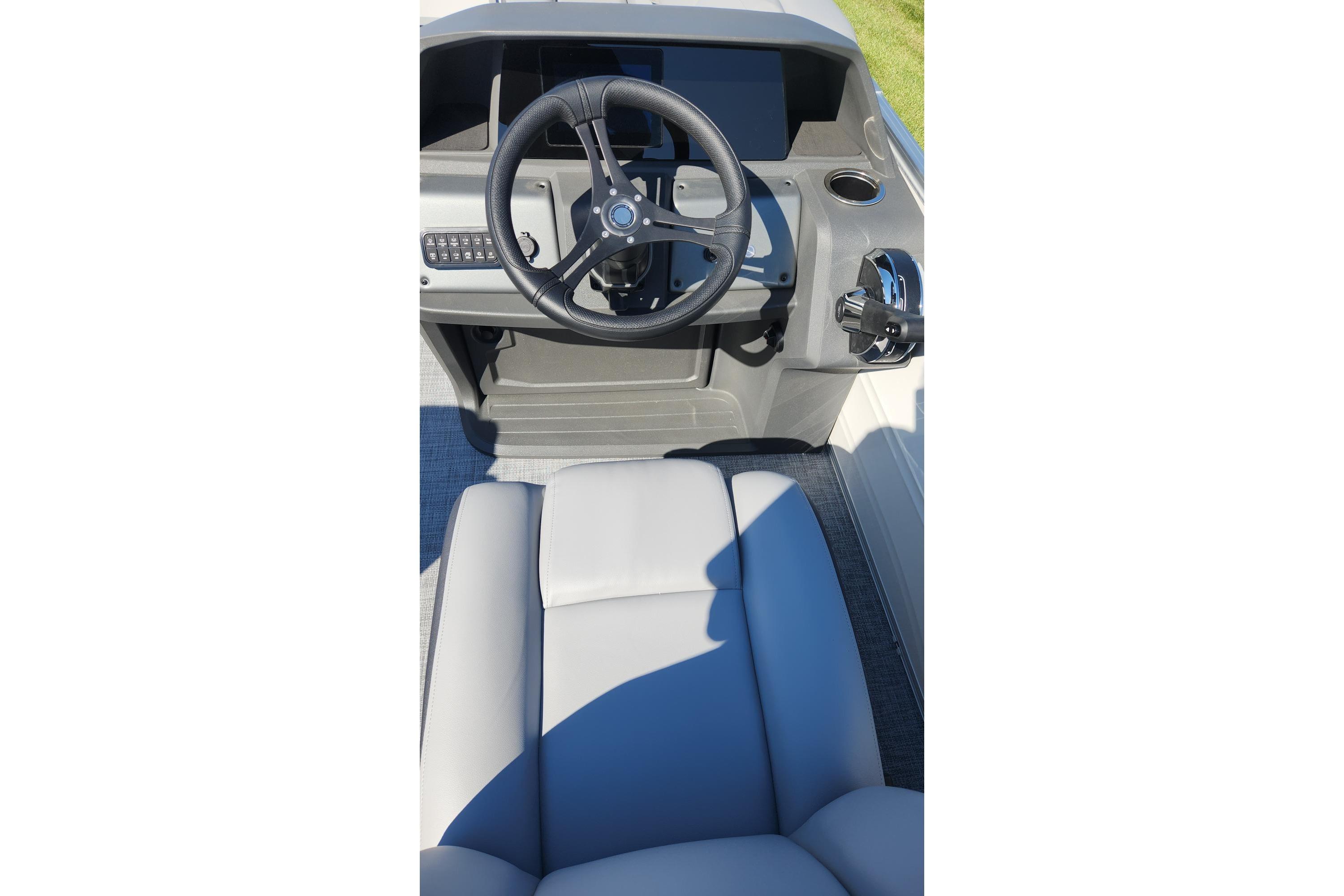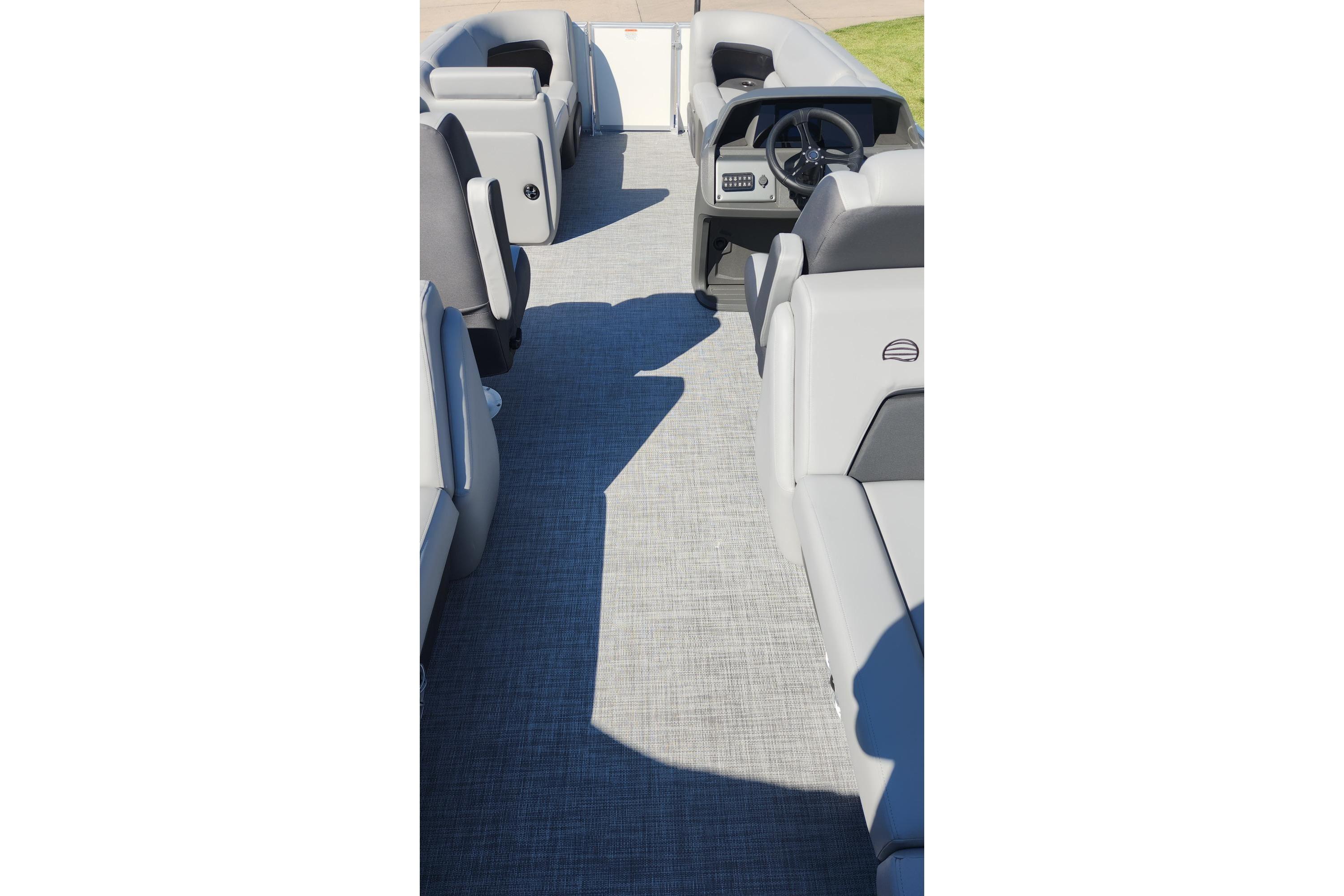 The 22 DLX gets an all-new interior loaded with comfortable seating for the 2026 model year. The four wraparound lounges have bright new accents that match the fence color and now feature cut-out sections in the backrest that offer more storage space and cupholders. Stow supplies under the seats and in the seat-back STOW MORE™ hidden compartments. The captain's console has also received a full redesign with upgraded tech. Even the flooring has been upgraded with a sophisticated and clean weave. Also new for 2026 is a wider, more ergonomic four-step boarding ladder that makes getting back into the boat easier.