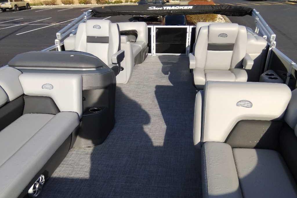The SUN TRACKER® PARTY BARGE® 22 DLX maximizes the pontoon’s seating to provide up to an 11-passenger crew with a living-room space.