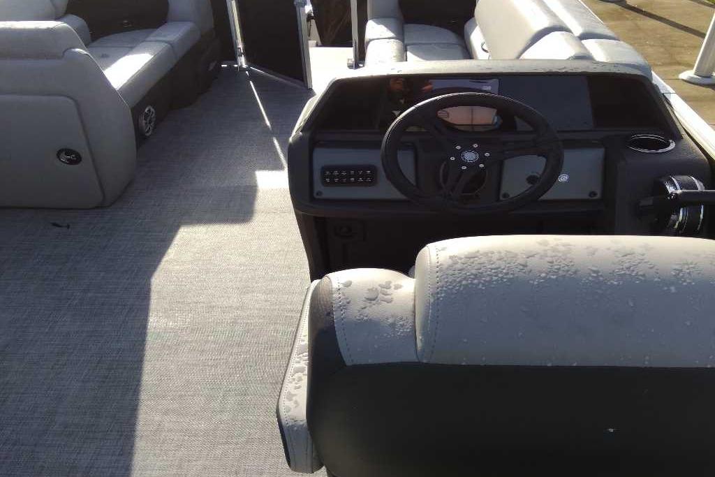The 22 DLX gets an all-new interior loaded with comfortable seating for the 2026 model year. The four wraparound lounges have bright new accents that match the fence color and now feature cut-out sections in the backrest that offer more storage space and cupholders. Stow supplies under the seats and in the seat-back STOW MORE™ hidden compartments. The captain's console has also received a full redesign with upgraded tech. Even the flooring has been upgraded with a sophisticated and clean weave. Also new for 2026 is a wider, more ergonomic four-step boarding ladder that makes getting back into the boat easier.