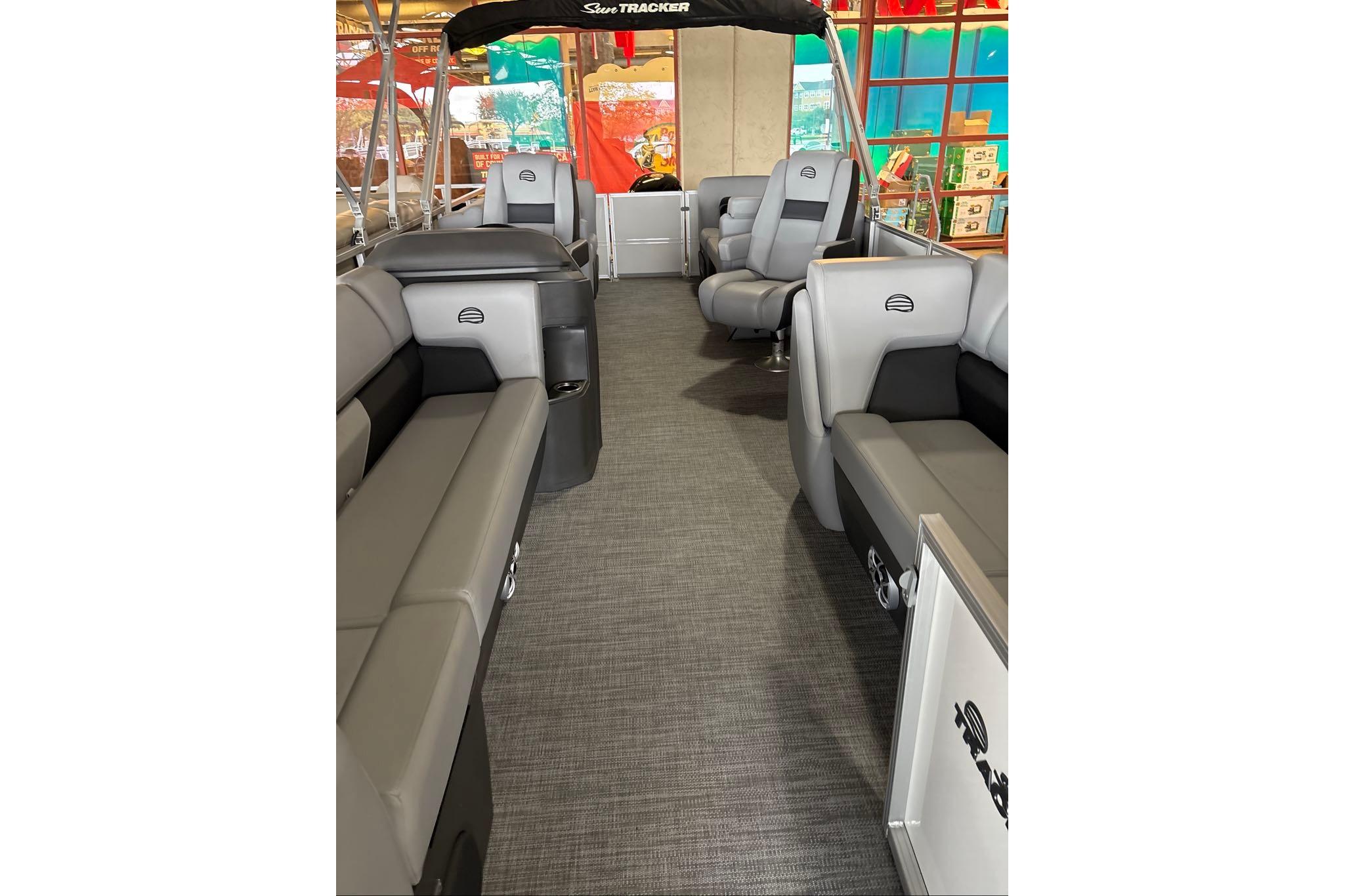 The SUN TRACKER® PARTY BARGE® 22 DLX maximizes the pontoon’s seating to provide up to an 11-passenger crew with a living-room space.