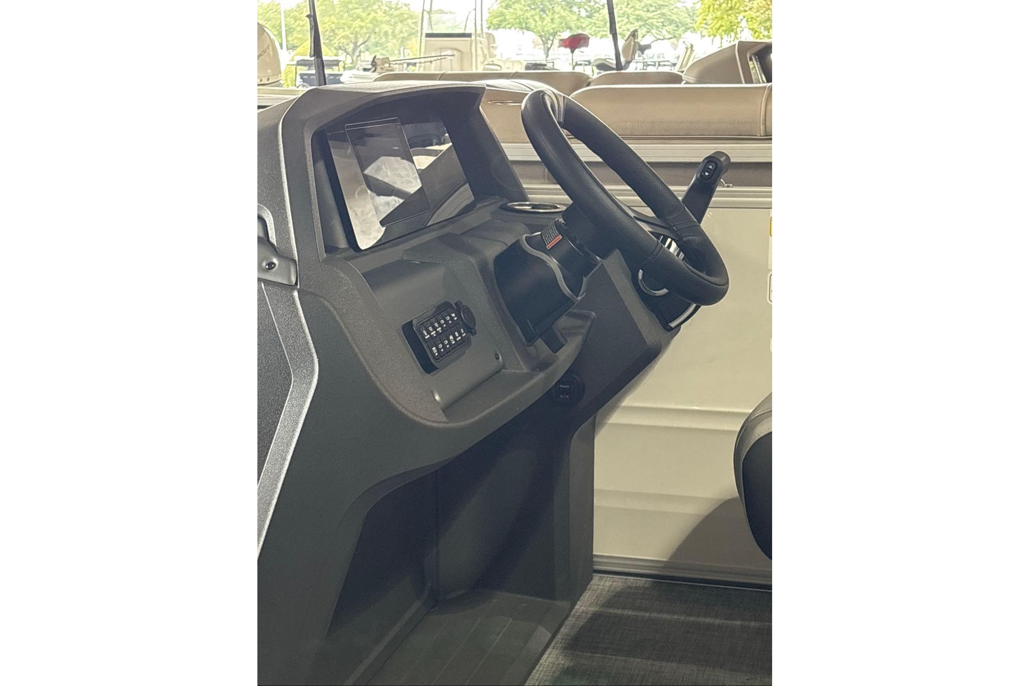 The 22 DLX gets an all-new interior loaded with comfortable seating for the 2026 model year. The four wraparound lounges have bright new accents that match the fence color and now feature cut-out sections in the backrest that offer more storage space and cupholders. Stow supplies under the seats and in the seat-back STOW MORE™ hidden compartments. The captain's console has also received a full redesign with upgraded tech. Even the flooring has been upgraded with a sophisticated and clean weave. Also new for 2026 is a wider, more ergonomic four-step boarding ladder that makes getting back into the boat easier.