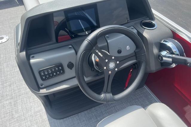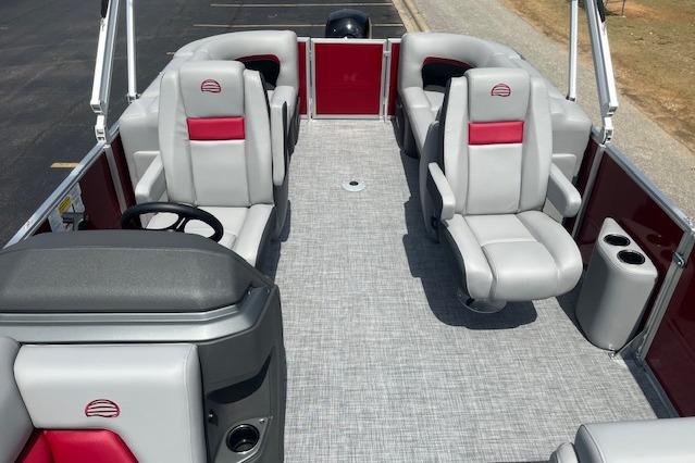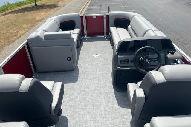 The 22 DLX gets an all-new interior loaded with comfortable seating for the 2026 model year. The four wraparound lounges have bright new accents that match the fence color and now feature cut-out sections in the backrest that offer more storage space and cupholders. Stow supplies under the seats and in the seat-back STOW MORE™ hidden compartments. The captain's console has also received a full redesign with upgraded tech. Even the flooring has been upgraded with a sophisticated and clean weave. Also new for 2026 is a wider, more ergonomic four-step boarding ladder that makes getting back into the boat easier.