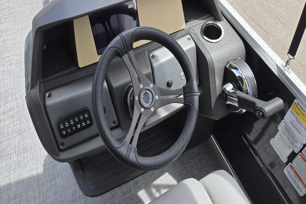 The 22 DLX gets an all-new interior loaded with comfortable seating for the 2026 model year. The four wraparound lounges have bright new accents that match the fence color and now feature cut-out sections in the backrest that offer more storage space and cupholders. Stow supplies under the seats and in the seat-back STOW MORE™ hidden compartments. The captain's console has also received a full redesign with upgraded tech. Even the flooring has been upgraded with a sophisticated and clean weave. Also new for 2026 is a wider, more ergonomic four-step boarding ladder that makes getting back into the boat easier.