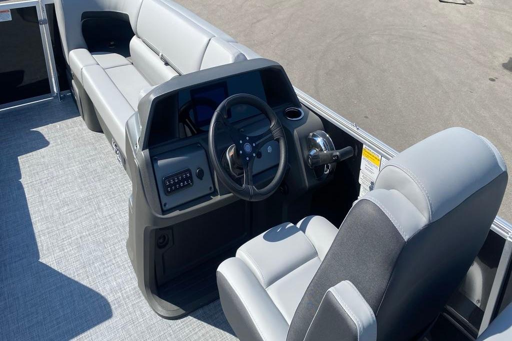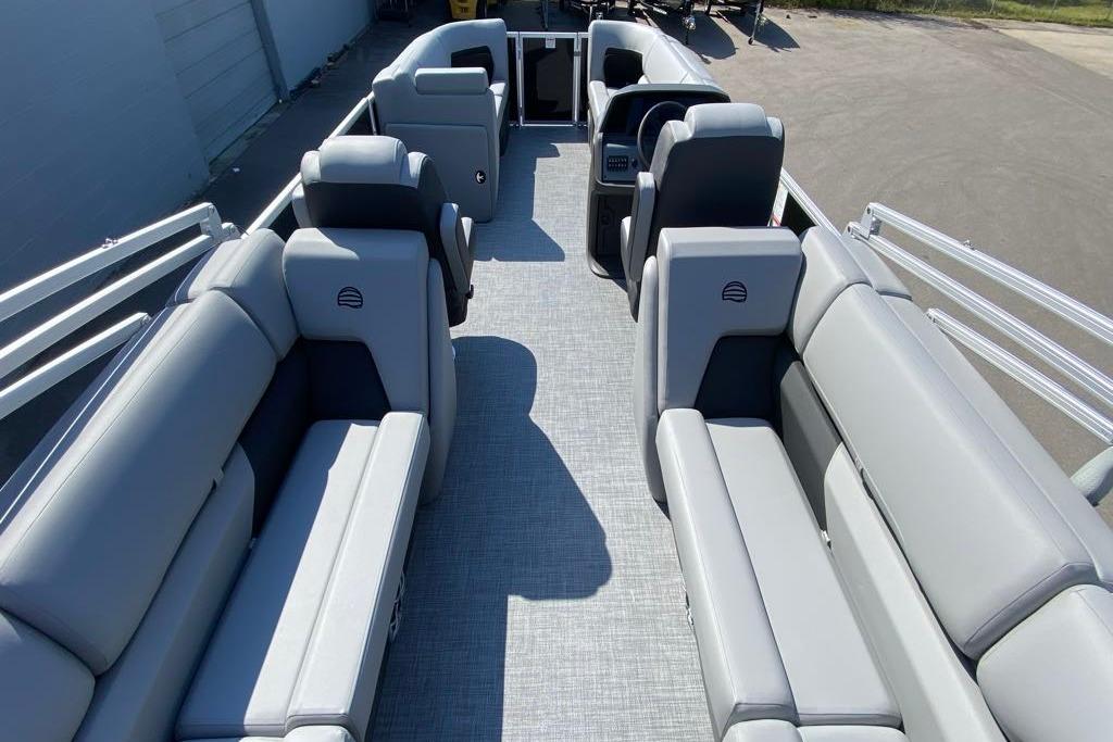 The 22 DLX gets an all-new interior loaded with comfortable seating for the 2026 model year. The four wraparound lounges have bright new accents that match the fence color and now feature cut-out sections in the backrest that offer more storage space and cupholders. Stow supplies under the seats and in the seat-back STOW MORE™ hidden compartments. The captain's console has also received a full redesign with upgraded tech. Even the flooring has been upgraded with a sophisticated and clean weave. Also new for 2026 is a wider, more ergonomic four-step boarding ladder that makes getting back into the boat easier.