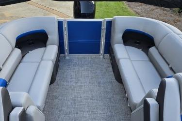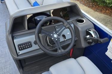 The 22 DLX gets an all-new interior loaded with comfortable seating for the 2026 model year. The four wraparound lounges have bright new accents that match the fence color and now feature cut-out sections in the backrest that offer more storage space and cupholders. Stow supplies under the seats and in the seat-back STOW MORE™ hidden compartments. The captain's console has also received a full redesign with upgraded tech. Even the flooring has been upgraded with a sophisticated and clean weave. Also new for 2026 is a wider, more ergonomic four-step boarding ladder that makes getting back into the boat easier.