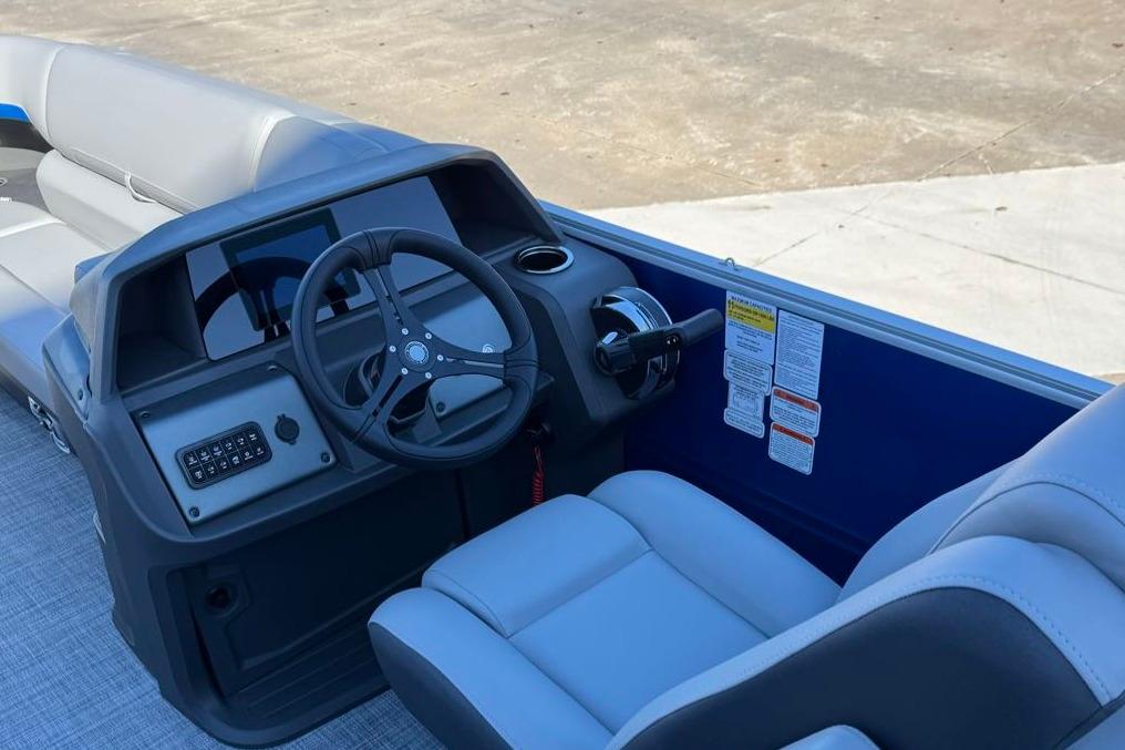 The 22 DLX gets an all-new interior loaded with comfortable seating for the 2026 model year. The four wraparound lounges have bright new accents that match the fence color and now feature cut-out sections in the backrest that offer more storage space and cupholders. Stow supplies under the seats and in the seat-back STOW MORE™ hidden compartments. The captain's console has also received a full redesign with upgraded tech. Even the flooring has been upgraded with a sophisticated and clean weave. Also new for 2026 is a wider, more ergonomic four-step boarding ladder that makes getting back into the boat easier.