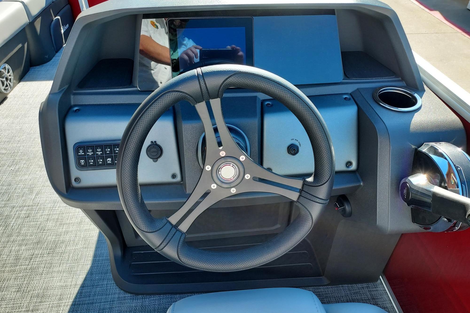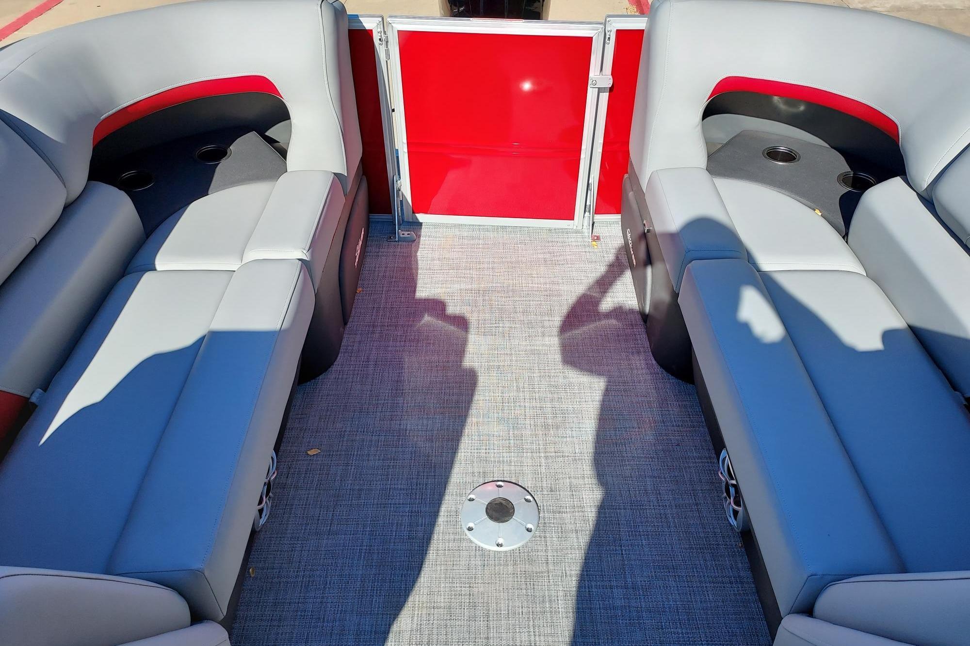The 22 DLX gets an all-new interior loaded with comfortable seating for the 2026 model year. The four wraparound lounges have bright new accents that match the fence color and now feature cut-out sections in the backrest that offer more storage space and cupholders. Stow supplies under the seats and in the seat-back STOW MORE™ hidden compartments. The captain's console has also received a full redesign with upgraded tech. Even the flooring has been upgraded with a sophisticated and clean weave. Also new for 2026 is a wider, more ergonomic four-step boarding ladder that makes getting back into the boat easier.