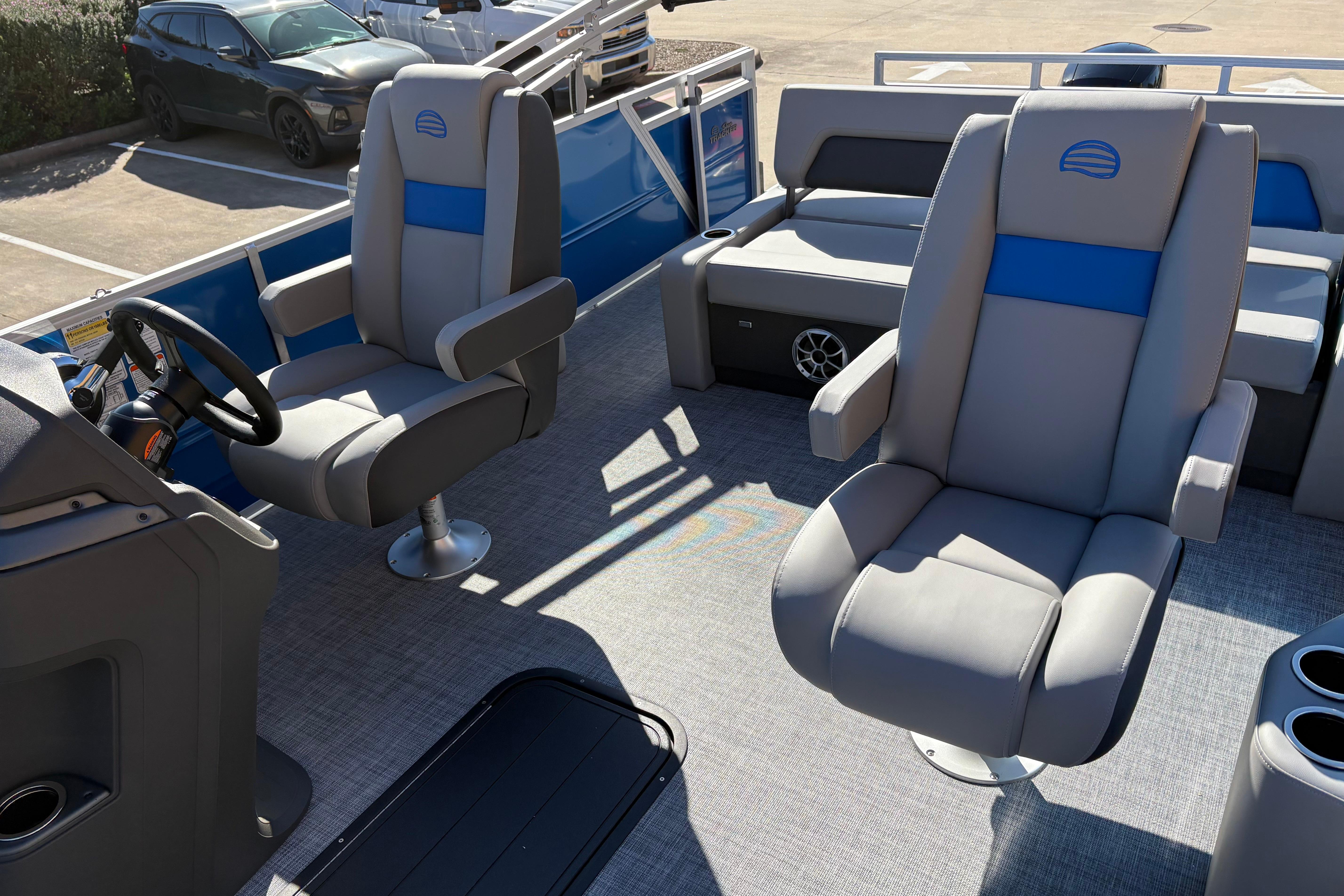 • Reclining, high-back swiveling helm bucket seat w/self-leveling armrests