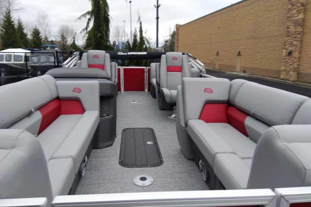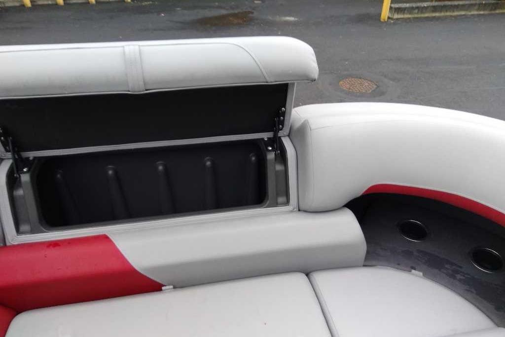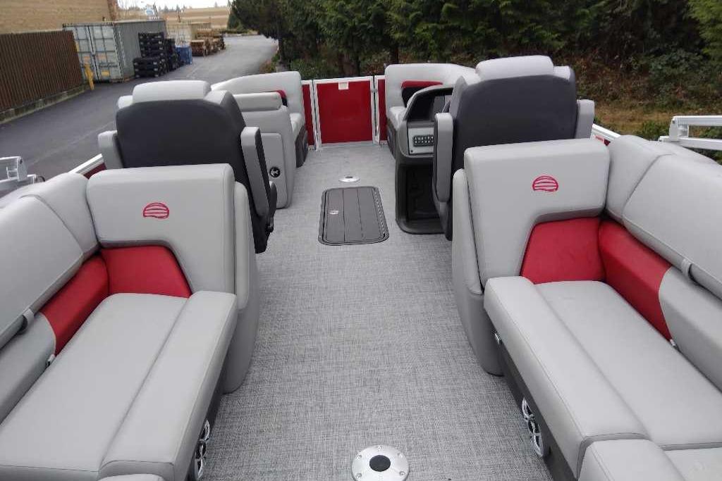 This year's 22 XP3 has an all-new interior has some exciting new features, including backrest cubbies that increase storage space and add extra cupholders that can keep larger bottles out of the way. The couches have bright accents that match the fence colors for an extra splash of style. The driver's console also got a big facelift with upgraded tech, making the PARTY BARGE the best-looking pontoon on the lake.